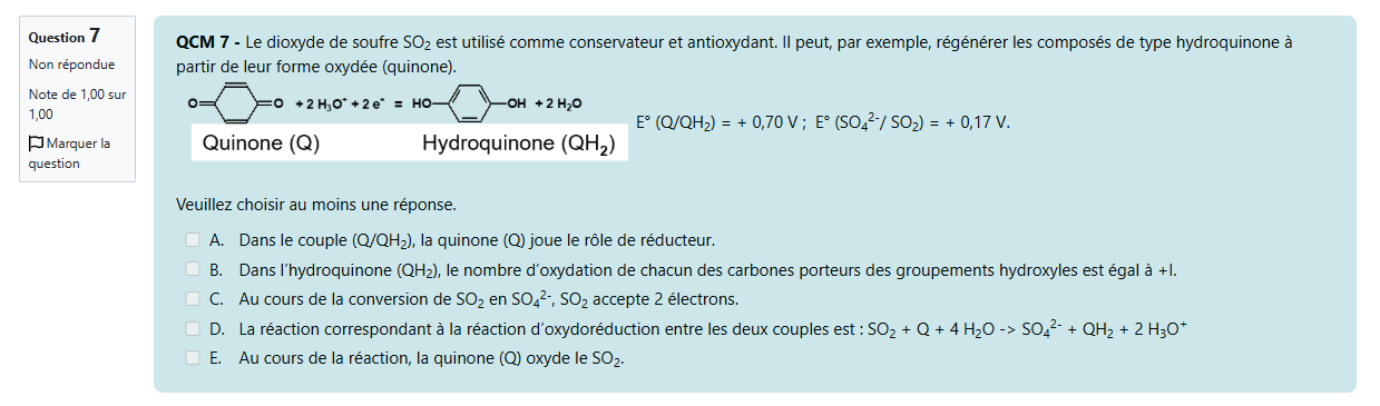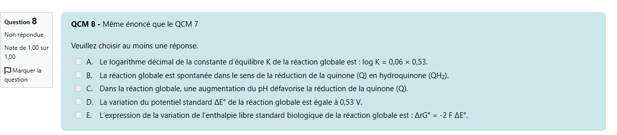 Laurent.npz Posted Monday at 08:56 AM Posted Monday at 08:56 AM Bonjour, il me semble qu'il y a une légère erreur sur un QCM moodle de redox. Je joins les screens. C'est l'item D du QCM 8 dont l'énoncé se trouve au QCM7. La variation d'enthalpie libre standard biologique s'écrit deltarG°' et pas deltarG° non ? C'est le genre de truc qui pourrait être compté faux d'habitude alors que là c'était juste. Merci de bien vouloir me donner plus d'infos à ce sujet. Quote