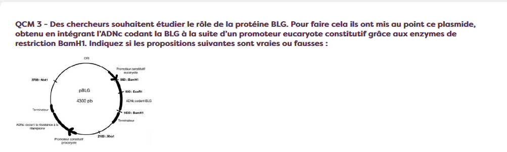 gnocchi Posted Friday at 06:51 AM Posted Friday at 06:51 AM Bonjour, J'ai une question sur ce plasmide Et voici les deux items qui me posent problème : D) Si les deux sites de restriction R1 et R2 sont accessibles à EcoR1, alors il n’y aura besoin que de cette enzyme de restriction pour la substitution. E)Si R1 est accessible à EcoR1 et si R2 est accessible à BamH1 alors on pourra réaliser un clonage orienté et obtenir un nouveau plasmide de 3950 pb. ( bon j'ai pas pu mettre les capture mais en gros sous chaque item D et E imaginez une image d'un gène linéaire qui va de R1 à R2 et qui fait 320pdb et qui s'appelle r51) En gros on veut remplacer le gène codant BLG par le gène dont je viens de parler (r51). Ma première question c'est , es ce qu'on a besoin de retirer BLG en entier pour mettre R51 à la place? Deuxième question, je comprends pas pourquoi la E est comptée juste parce que si on digère par BAMH1 et EcoR1 on va obtenir 3 fragment dans le plasmide et donc on va pas pouvoir insérer r51 parce que ECOR1 sera plus sur le plasmide vu que BAMH1 va couper en Deux endroit du plasmide . Ou alors peut être que au niveau de BAMH1 860, la cassure va se recoller et le gène va s'insérer entre ECOR1 et BAMH1 1450 mais dans ce cas le plasmide obtenu fait 3750 pdb ( et pas 3950). Je sais pas si je suis claire (je vous ai mis des petites couleurs hihi) Mercii Ambryon 1 Quote