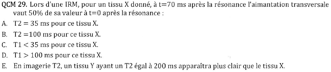 Solution McIlroy Posted December 27, 2016 Author Solution Posted December 27, 2016 Voici la correction complète de ce QCM : ENJOY (Correction item A et B ) Salut, L'énoncé te donne : Mx(t = 0,7) = 0,5Mx(t = 0) Donc, rapidement => e-0,07/T2 = 0,5 T2 = -0,07/ln(0,5) = -0,07/(-0,7) = 100ms Voilà, n'hésite pas si tu veux que je détaille plus le calcul Salut Voici une explication pour les items suivants : C/D : Après avoir calculé le T2 = 100 ms, tu peux en déduire une valeur approché du T1 car le T1 est toujours plus grand que le T2 (sauf dans le cas de l'eau ou T1 = T2). Donc le T1 est forcement plus long que 100 ms. Ensuite pour l'item E : On sait que plus le T2 est élevé plus le tissus apparaît clair, comme 200 ms > 100 ms, le tissus Y est donc plus clair que le tissus X. J'espère que j'ai bien répondu à ta question ?