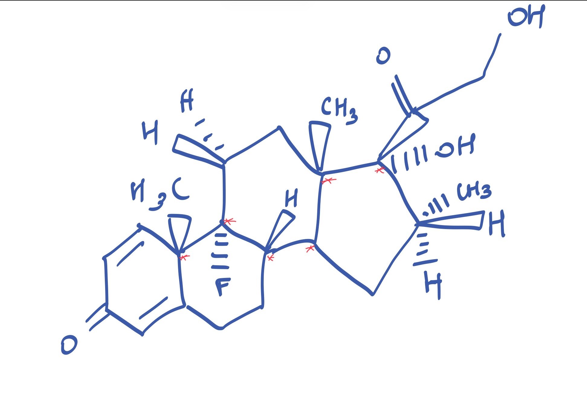 Voici les carbones asymétriques que j’ai trouvé. Selon moi il y en a que 6. Pour le carbone 16, il y a une erreur ce n’est pas possible que 5 substituants soient liés à 1 carbone. C’est maximum 4 liaisons. Pour rappel les carbones asymétriques doivent avoir 4 substituants différents.
