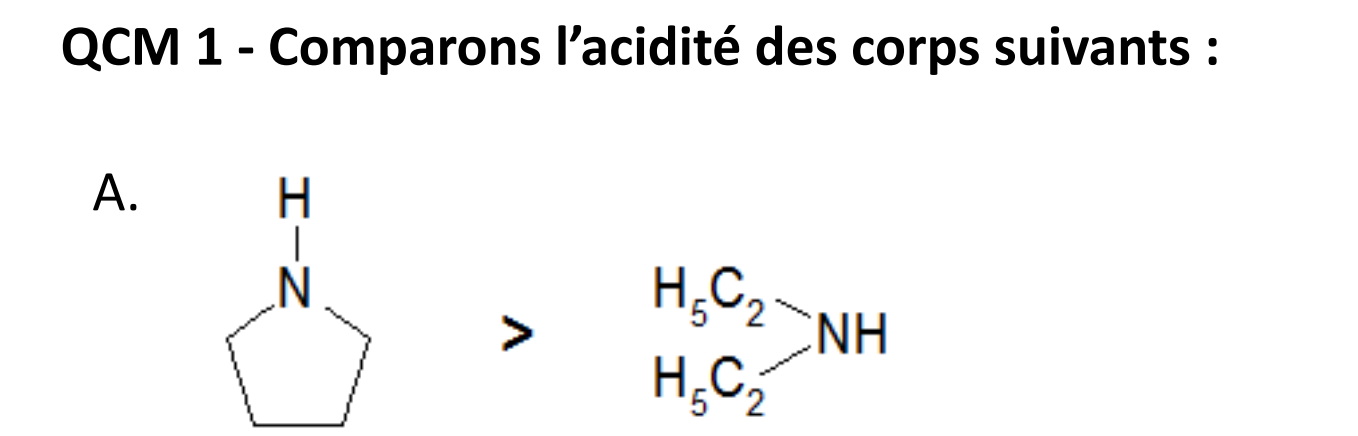 Tuteur Solution columbo Posted Thursday at 11:52 AM Tuteur Solution Posted Thursday at 11:52 AM Bonjour @amelie.chm ! il faut que tu réflechisses plutôt en terme de basicité, car on compare des amines : dans le cours, il a été dit : une base est d'autant plus forte que l'atome porteur du doublet : est disponible et pas encombré. dans le qcm : La pyrrolidine est plus basique car sa structure cyclique diminue l'encombrement autour de l'azote (en tirant les chaînes vers l'arrière), ce qui rend le doublet plus disponible et l'ion positif mieux stabilisé par le solvant. donc si elle est plus basique elle est moins acide que l'amine linéaire (diéthylamine). J'espère avoir réussi à répondre à ta question. Rayanodipine 1 Quote