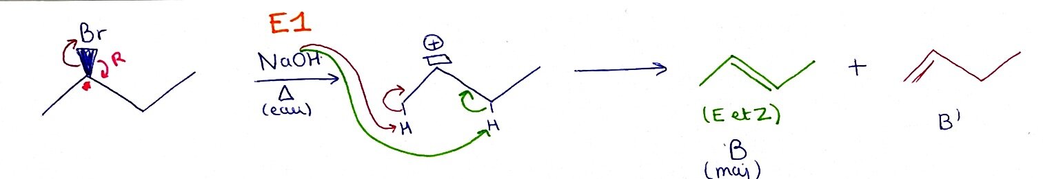 mickael_du Posted 6 hours ago Posted 6 hours ago Tout d'abord pour la A on est bien dans condition d'élimination car Soude à chaud. Ensuite je vois que le Carbone liée au Br formerai un carbocation secondaire si on lui élimine le brome. Ce faisant on est soit en E1 ou E2. Sauf qu'on nous dit que la réaction se passe en présence d'eau qui est un solvant polaire protique. Et donc un solvant polaire protique vient stabiliser le carbocation et donc on passera par une E1 et pas une E2 (il aurait fallu que le solvant soit polaire Aprotique). Et pour le fait d'obtenir un composé majo/minoritaire c'est du à la stéréosélectivité de la E1 (on forme E en majorité) et aussi à la régiosélectivité (applicable à E1 et E2) avec la règle de Zaïtsev (on forme l'alcène le + substitué en majorité). Voilà j'ai compris ça de mon coté j'espère ça t'aidera. sanspseudo and Rayanodipine 2 Quote