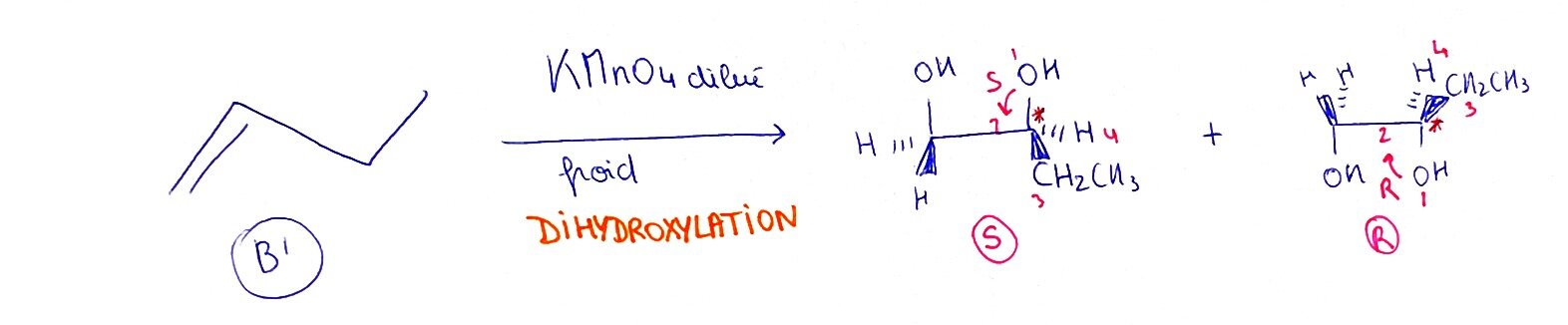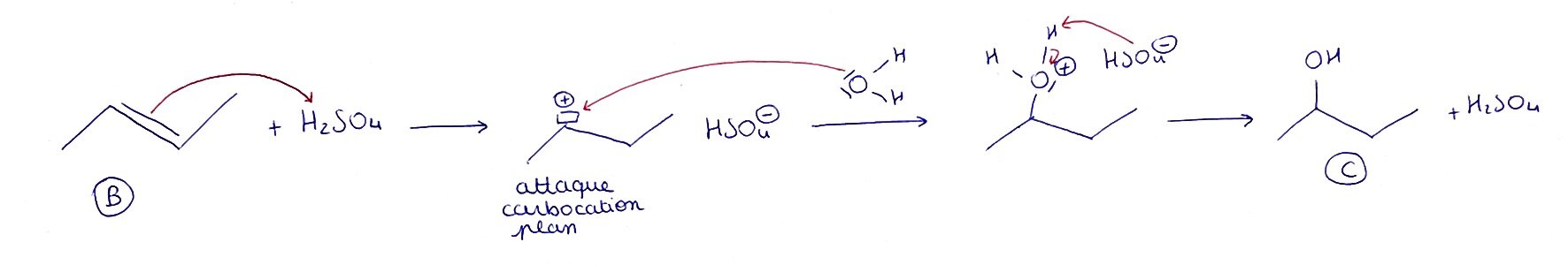 Tuteur laurazépam Posted 6 hours ago Tuteur Posted 6 hours ago Coucou, Ok pas de problème on va reprendre le QCM pas à pas ! Item A : Le composé A réagit avec une base à chaud dans un solvant protique (eau) c'est donc bien une réaction d'élimination qui est favorisée. Maintenant pour savoir si c'est une E1 ou une E2 tu regardes le solvant. Ici on a un solvant protique (eau) donc c'est une E1 qui est favorisée. Dans ta molécule tu peux éliminer l'hydrogène à 2 endroits donc tu obtient 2 composés : Pour savoir quel alcène est prioritaire tu utilises la règle de Zaïtsev qui indique que l'alcène le plus substitué est le plus stable (et donc le majoritaire). L'item A est FAUX Item B : Le composé B réagit avec de l'eau en milieu acide, il s'agit d'une réaction d'hydratation. Cette réaction est non stéréospécifique car tu as l'attaque de l'eau sur un carbocation plan, tu obtiens ainsi les composé R et S. Je te remet ici le mécanisme avec la molécule B pour t'aider ;) L'item B est VRAI Item C : Que l’on parte du but-2-ène E ou Z, l’hydratation en milieu acide conduit au même composé. En effet, la réaction passe par la formation d’un carbocation secondaire plan, identique dans les deux cas. L'item C est VRAI Item D : Il s'agit ici d'une réaction de dihydroxylation, c'est à dire d'une addition du même côté de 2 groupements -OH : Tu remarques que tu as un seul carbone asymétrique car le carbone 1 est lié à 2H L'item D est FAUX Item E : Ici il faut utiliser le mécanisme réactionnel ci-dessus. Il ne faut pas oublier que l'addition des groupements -OH peut se faire de part et d'autres du plan de l'alcène donc tu obtient bien un mélange racémique. L'item E est VRAI J'espère que c'est plus clair pour toi et n'hésites pas si tu as d'autres questions :) Bon courage. sanspseudo, Rayanodipine and fannYttrium 1 1 1 Quote