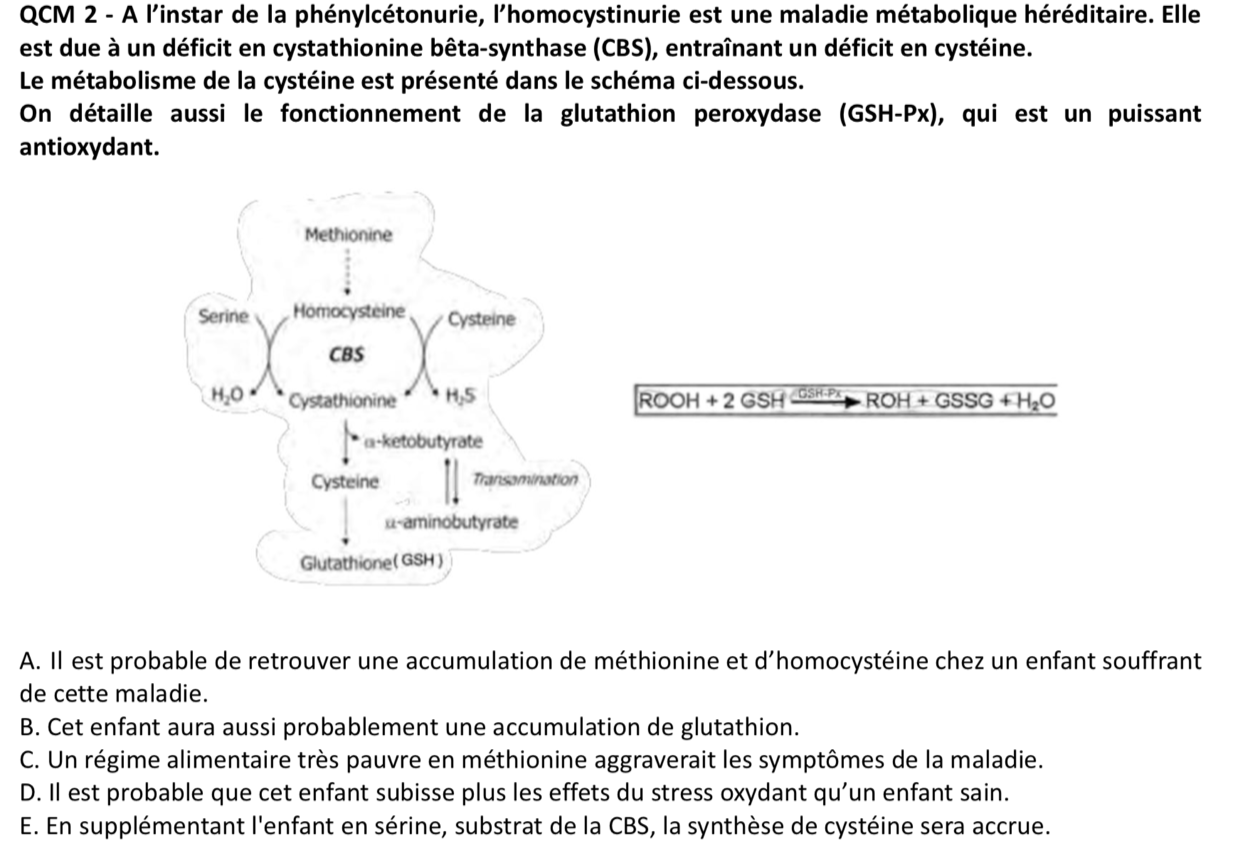 Sadlv Posted Friday at 02:38 PM Author Posted Friday at 02:38 PM Mercii beaucoup c’est hyper clair ! J’avais aussi une question sur le qcm suivant L’item E est marqué vrai : E. (VRAI) On diminue la concentration d'homocystéine dans le sang donc dans les urines. Mais pour moi l’absence de CBS provoque déjà un accumulation en méthionine qui sera aggravé si le MTHFR est surexprimé. Du coup je comprends pas quel logique il faut avoir dans ce genre de qcms (et dans les qcms de recherche en général) Quote