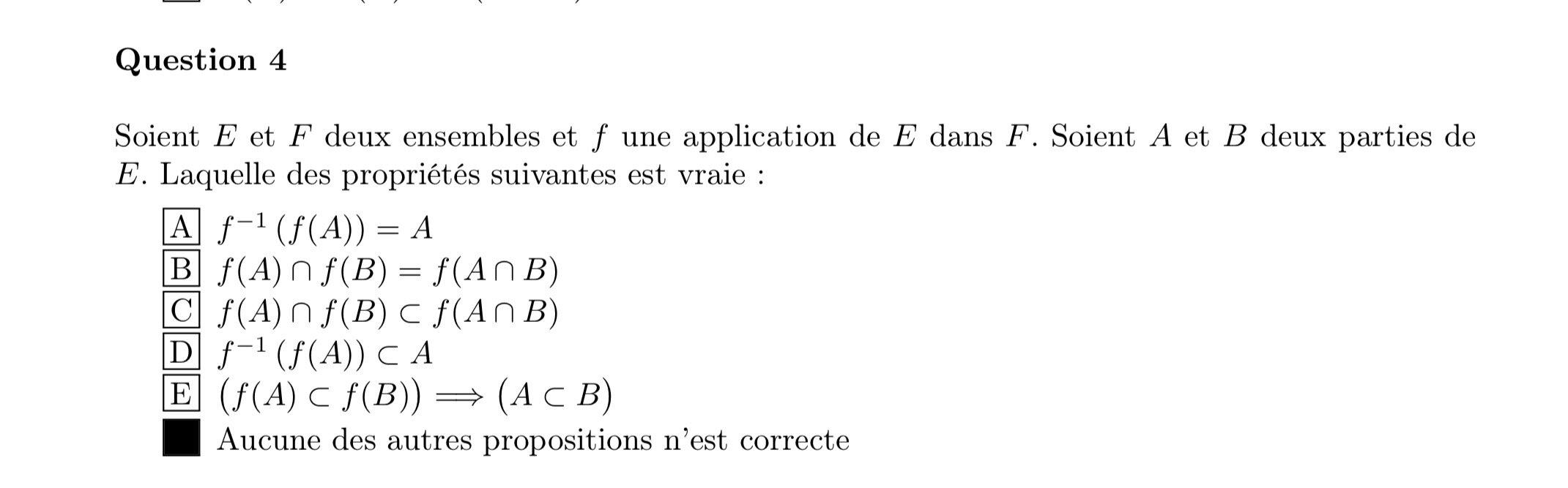 Ancien Responsable Matière Solution Movgde Posted February 14 Ancien Responsable Matière Solution Posted February 14 Salut ! @axoneme Généralement ça sera valable pour tous les QCMs à moins qu’ils indiquent le contraire. De toute façon, pour ce qcm, il fallait que ça fonctionne pour dans tous les cas, car les ensembles et l’application données sont quelconques. Donc si on ne te précise pas que F est injective (ou surjective, bijective…), il faut partir du principe que l’affirmation doit être vrai dans TOUS LES CAS. Quote