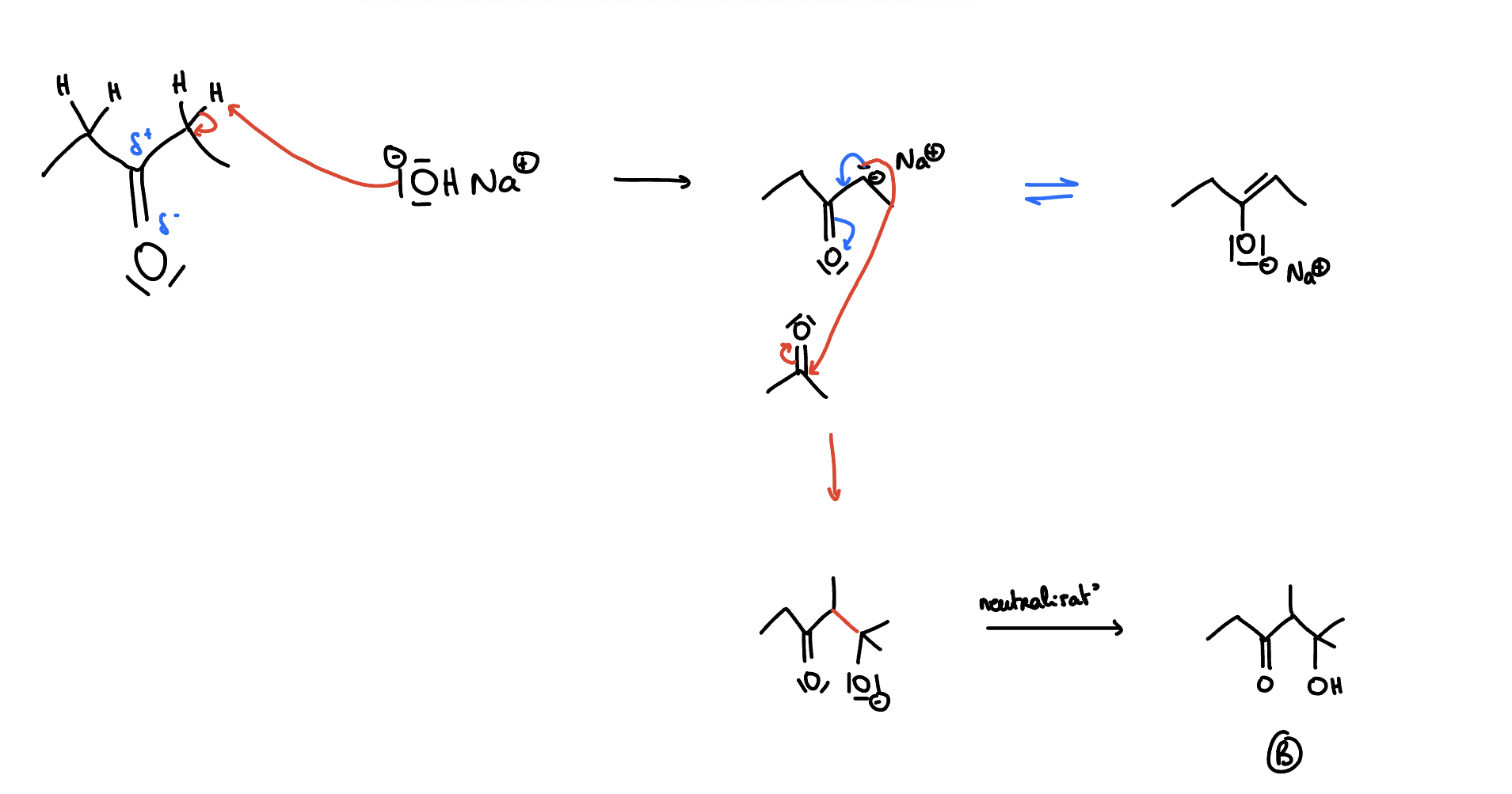 Ribozoz Posted February 21 Posted February 21 Hello je n’arrive pas à dessiner la réaction du QCM et elle ne figure pas dans la correction : QCM 23 : La pentan-3-one A traitée par la soude (NaOH), puis condensée sur la propanone conduit après neutralisation à B. La réaction de A avec la soude conduit à la formation d'un ion énolate. B possède deux carbones asymétriques. B peut être la (4R)-5-hydroxy-4,5-diméthylhexan-3-one. La réduction de B par NaBHa conduit à un diol. B possède 3 carbones hybridés sp2 Quelqu’un peut m’aider svppppppp Quote