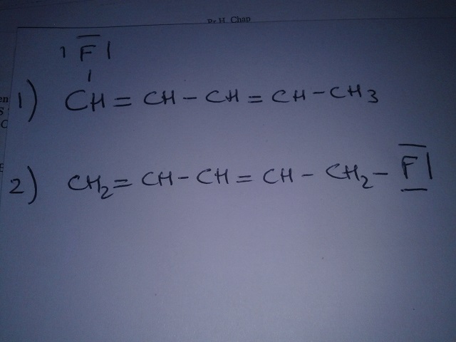 Ancien du Bureau Linda Posted December 23, 2013 Ancien du Bureau Posted December 23, 2013 Bonsoir, j'ai un peu de mal à résoudre ce QCM, qui porte sur les molécules de 1-fluoropenta-1,3-diène et de 5-fluoropenta-1,3-diène (est-ce que ce ne sont pas les mêmes molécules d'ailleurs ?). Il faut trouver les formes limites de ces deux composés et je ne comprends pas comment faire puisqu'il y a les doubles liaisons et le fluor et ce n'est pas précisé dans le cours si l'un est prioritaire sur l'autre pour le déplacement d'électrons... Je ne sais pas si c'est très clair Merci d'avance