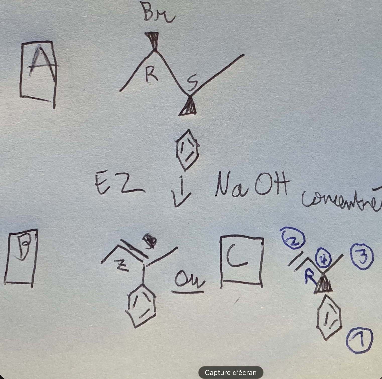 GlYcine Posted February 23 Posted February 23 Bonjour, je rencontre des difficultés à répondre face à ce type d’item : Consigne du QCM : Le (2R, 3S)-2-bromo-3-phényl-butane A placé dans un solvant polaire aprotique et soumis à l’action de la soude concentrée conduit à un composé majoritaire B et à un composé minoritaire C et voici l’item qui me pose souci : Le composé C possède un seul carbone asymétrique de configuration R. Quelqu’un aurait-il la gentillesse de m’expliquer comment résoudre ce genre d’item ? Merci d’avance !! Bonne après-midi ! Quote