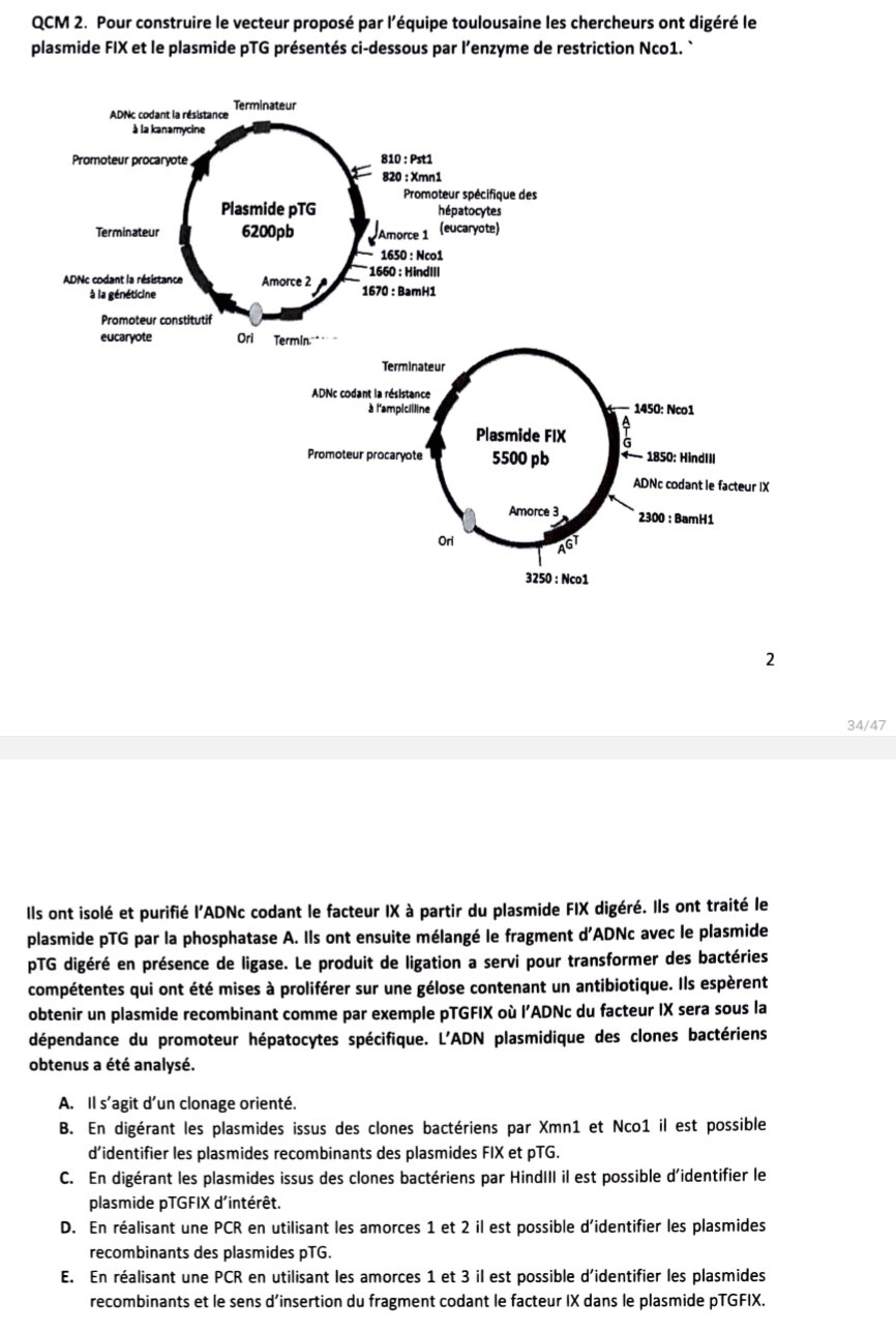 Responsable Matière Solution An-Schwann Posted February 25 Responsable Matière Solution Posted February 25 Salut! Je vais passé item par item : Item B : Si on a un plasmide recombinant, Nco1 va extraire le fragment contenant l’ADNc codant le facteur IX, de 1800 pb, et un fragment contenant le promoteur grace à la coupure réalisé par xmn1 de 830 pb, et un troisième bou qui est juste le reste du plasmide. si on a pas un plasmide recombinant, alors la coupure de ces deux enzymes coupera autour du promoteur, donnant un fragment de 830 pb et va libéré le reste du plasmide donc on a deux cas : 1) on a le plasmide recombinant, dans ce cas on aura donc trois morceau après cette digestion. 2) le plasmide n’a pas intégré l’ADNc voulu, dans ce cas on aura que deux morceau. ducoup on pourra bien vérifier si on a un plasmide recombinant ou pas juste en faisant une digestion par Xmn1 et Nco1. Item C: Dans cette item on cherche le plasmide d’intérêt, c’est a dire le plasmide ayant intégré l’ADNc dans le bon sens. Quand on observe notre ADNc d’intérêt dans le plasmide FIX, on remarque qu’il possède un site de coupure Hindlll, et que ce site de coupure n’est pas au centre de l’ADNc. Donc si on coupe par Hindlll, on aura un résultat différent en fonction du sens d’insertion de l’ADNc. Une digestion par Hindlll permettra bien de séléctionner les plasmide d’intérêt. item D : Ici on fait une PCR, en utilisant les amorces 1 et 2. En faisant cette PCR, on aura ca va répliqué l’ADN entre les deux amorces. Si le plasmide est recombinant, c’est a dire qu’il a intégrer de l’ADNc, alors la PCR lors de la replication, va répliquer le fragment d’ADNc insérer car le site d’insertion ce trouve entre les deux amorces. En gros ici il faut faire attention a ce qu’il te demande: soit c’est juste est ce qu’on a un plasmide recombinant (qui a insérer de l’ADNc, que ce soit à l’envers ou dans le bon sens)? Ou est ce que c’est dans le bon sens? C’est plus claire? Hélie and Batman_sans_Robin 2 Quote