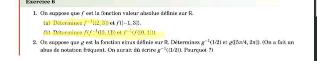 Ancien Responsable Matière Movgde Posted 14 hours ago Ancien Responsable Matière Posted 14 hours ago Salut @edy-pass ! f de moins un correspond à la fonction réciproque c’est à dire : En gros si on se pose que f(x) = y; f de moins 1 revient à trouver une fonction (qu’on va appeler r pour éviter d’écrire f de moins) tel que r(y) = x; attention subtilité, il peut exister plusieurs x pour un même y si on prend l’exemple de la fonction valeur absolue : f(x) = x et f(-x) = x donc la fonction réciproque r(x) = {-x};{x} Donc si on cherche r([2;3]), ça revient à chercher les x tels que f(x) est compris entre [2;3] donc on se retrouve avec l’ensemble [-3:-2]U[2;3] Dans cette exemple il existe pas de « jolie fonction réciproque », faut un peu sortir les résultats de son chapeau. Si on prend un autre exemple f(x)= 3x+2 =y dans ce cas la fonction réciproque serait r(y) = (y-2)/3 = x Le but de la fonction réciproque est de retrouver les antécédents(x) à partir d’une image (y) En espérant avoir pu t’aider, hésite pas si t’as besoin d’aide pour le (b) ! Quote