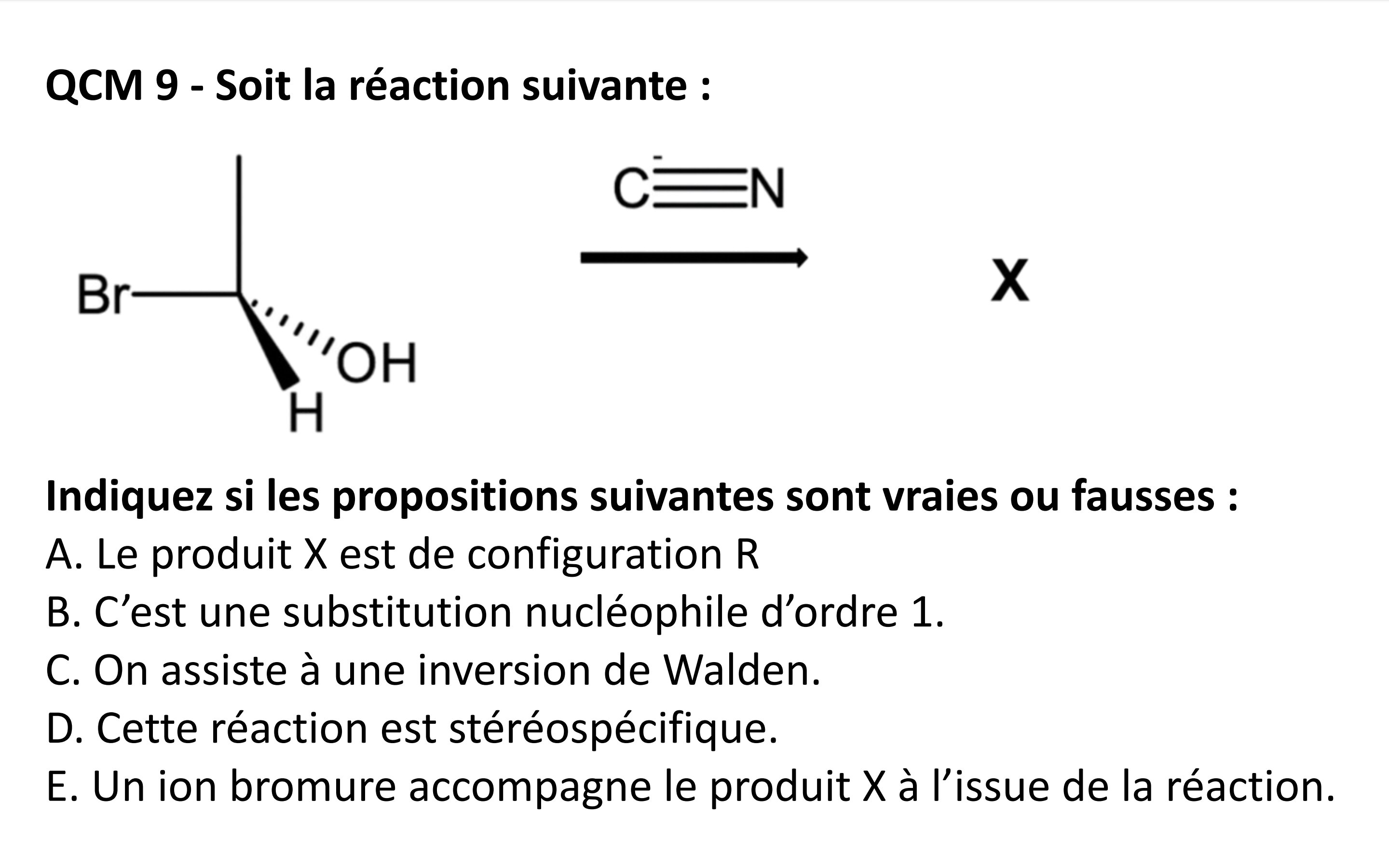 Tuteur Solution elec Posted Sunday at 08:37 AM Tuteur Solution Posted Sunday at 08:37 AM Hello @chloémoglobine ! Cet item est un peu piégeux je te l'accorde haha Une inversion de Walden signifie qu'on a une attaque du nucléophile à l'opposé du groupement partant (et donc que la réaction est stéréospécifique). C'est bien le cas ici : le C triple liaison N attaque à l'opposé du Brome. Donc il y a bien une inversion de Walden. En revanche attention : d'habitude ça crée une inversion de configuration absolue (c'est-à-dire qu'une molécule S devient R ou inversement) SAUF QUE ici lorsqu'on recherche si c'est du R ou du S après la réaction, on se rend compte que le 1 n'est plus porté par le même groupement (au départ c'était le brome, mais comme il est parti ça devient le OH). Et donc le composé final est aussi en R, comme le composé initial. Ca ne veut pas dire qu'il n'y a pas eu d'inversion de Walden ! On appelle ça l'inversion de Walden avec rétention de configuration (aka inversion de Walden mais pas de changement R ou S). J'espère que tu comprends mieux, sinon n'hésite pas si tu as d'autres questions et bon courage ! L'Electron_Augé and Rayanodipine 2 Quote