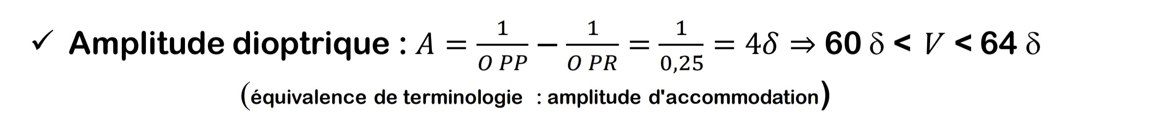 Tuteur Solution Opéra Posted March 10 Tuteur Solution Posted March 10 Salut @Hemilyse, pas de soucis je t'explique. On te demande ici de calculer une amplitude d'accomodation (ou amplitude dioptrique) d'un jeune homme pour la comparer à celle d'un cormoran. Pour celà, tu calcule l'amplitude dioptrique à partir de la formule donnée dans ton cours "L'œil et ses défauts" que je t'ai remise ci-dessous. On n'utilise pas l'indice optique dans cette formule. Sachant que OPP = 16cm et 0PR = infini, tu trouves A = 1/0,16 = 6,25 Donc le QCM est vrai Est-ce que c'est plus clair ? Hemilyse 1 Quote