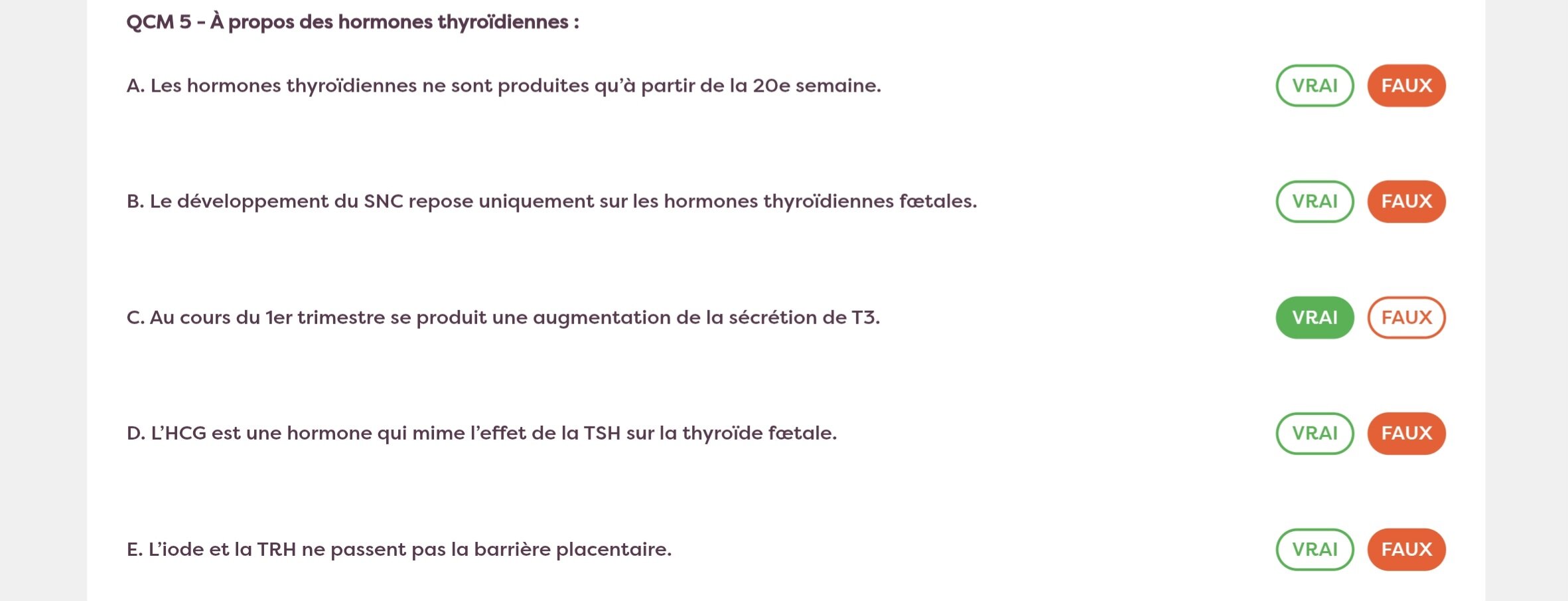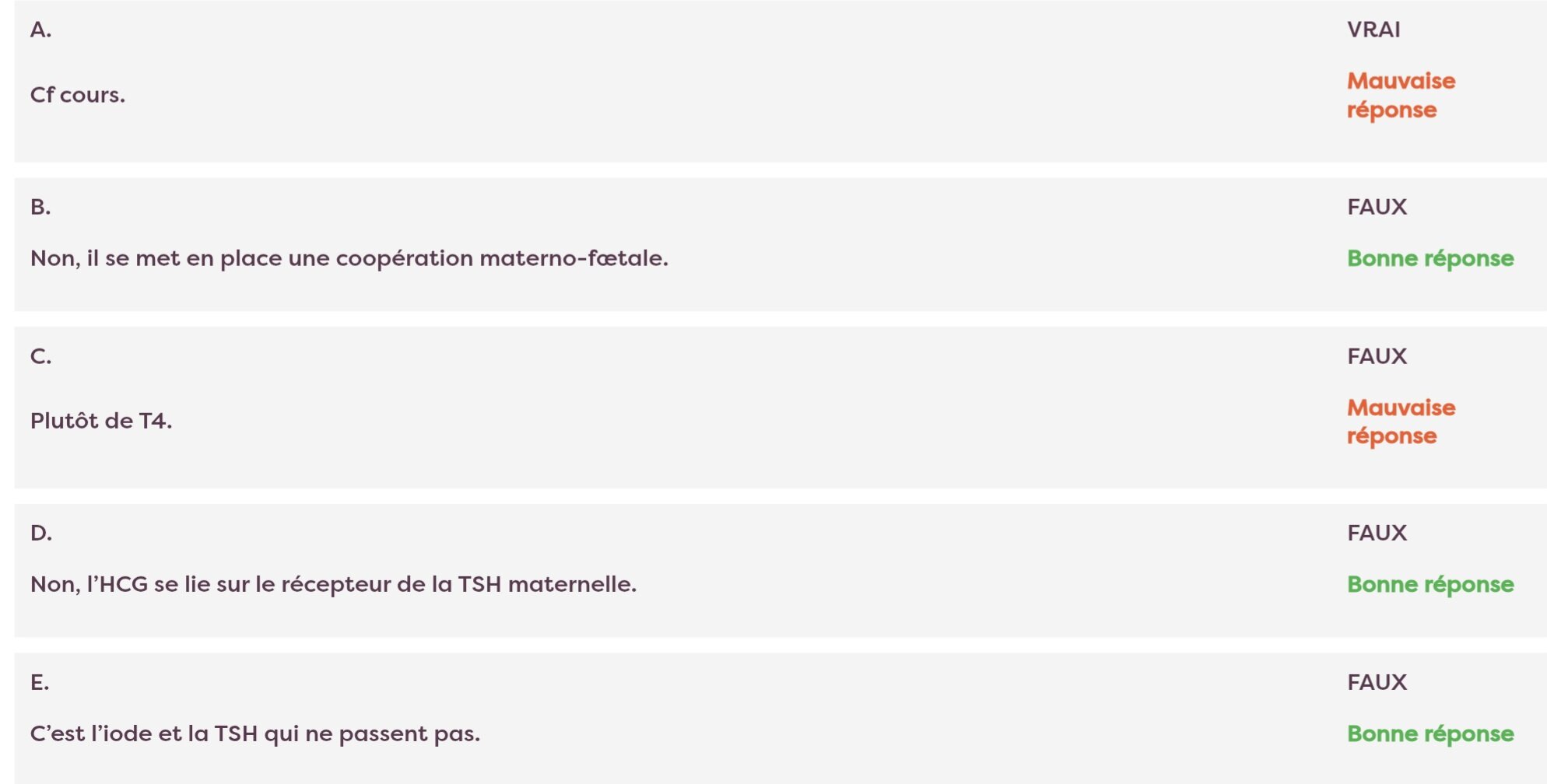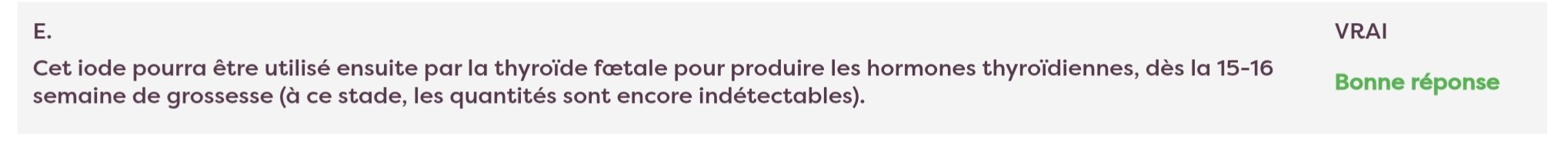 Solution MahelpMeDoc Posted 12 hours ago Solution Posted 12 hours ago SAlut, je sais pas d'où viennet les qcm mais : D'après le cours, la thyroïde devient fonctionnelle vers la 10ème semaine, MAIS ne commencent à produire des hormones qu'à la 20ème semaine lorsque la TRH foetale est produite. Et je n'ai pas vu de mention de 15ème-16ème semaine dans le cours mais je pense il faut retenir 20ème semaine comme c'est mentionné dans le cours : Ensuite, il y a une erreur dans la correction du qcm, mais l'item est bien faux. La TRH et l'iode passent la barrière placentaire (sinon il ne pourrai pas y avoir de production d'hormones thyroïdiennes foetales), mais pas TSH. C'est pas la première fois que les corrections se contredisent, et je pensent ça vient du fait que parfois les gens notent les corrections de qcm qu'ils n'ont pas fait et ducoup se perdent un peu ou un truc comme ça... BREF au final t'avais bien raison et n'hésite pas si c'est pas clair ! emmie.vln, Lénadénine and chloémoglobine 3 Quote