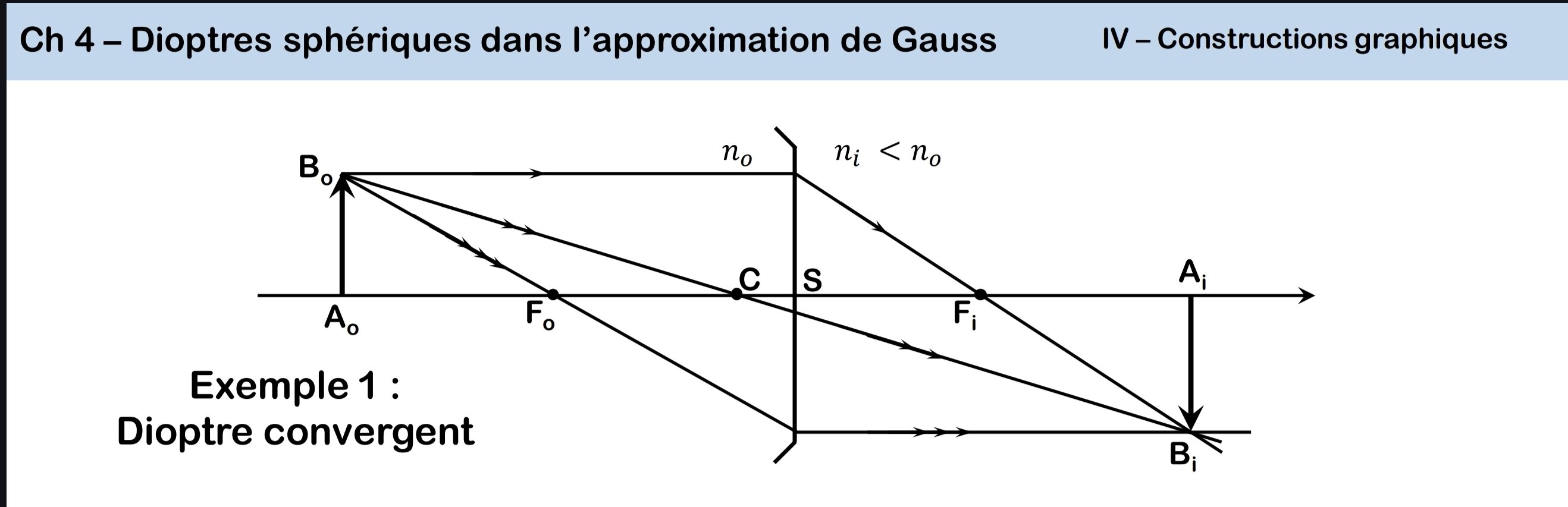 Tuteur Opéra Posted March 16 Tuteur Posted March 16 Salut, @AUDRÉTICULUM désolée pour ma réponse un peu tardive, je vais essayer de répondre à un maximum de tes questions. • Je ne comprends pas pourquoi un rayon passant par le sommet d’un dioptre est dévié ? Même si les indices sont différents il me semblait que le rayon n’était pas dévié ? (Fichier « rayon sommet) Ici, il me semble que le rayon n'est pas dévié s'il passe par C et non par S, un rayon passant par le sommet est donc bien dévié (je t'ai mise la figure de ton cours). • je ne comprends pas en quoi on peut dire que que le dioptre, le bocal, est convergent alors que d’après les calculs on a bien un objet réel (le poisson) et une image virtuelle (plus près du sommet) , avec foyer image coté image virtuelle et foyer objet coté objet virtuel, ainsi que SAi<0 ? Comment peut on conclure avec tout ca que l’on est dans un dioptre convergent ? (Fichier vergence) Il te faut ici calculer la vergence du dioptre d'après la formule de ton cours (à connaître par coeur !!!) : V = (ni-n0)/SC avec ni = 1, n0 = 4/3 et SC = (-0,12) Donc V = 2,77 > 0, le dioptre est bien convergent. Si tu doutes, c'est la valeur de la vergence qui détermine si ton dioptre est convergent ou divergent, n'hésite pas à la calculer pour être sûre. • je ne comprends pas trop les histoire de ponctum Proximum, j’ai compris ce que c’était etc, mais je ne comprends pas comment manier les formules (quand utiliser 1/OPP - 1/OPR ou 1/OPR-1/OPP par exemple) Ce n'est en effet pas un concept facile à comprendre, je te conseille cette chaîne qui explique plutôt bien je trouve : https://www.youtube.com/@physikragot6915 (tout un chapitre sur l'optique, notamment sur les lentilles correctrices). Et pour ce qui est des calculs je confirme la réponse de @Hemilyse Bon courage pour tes révisions, n'hésite pas si tu as d'autres questions. Hemilyse 1 Quote