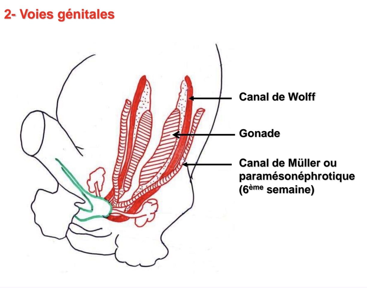 Tuteur Solution Maelyscl Posted March 14 Tuteur Solution Posted March 14 Saluut, je vais essayer de t’expliquer.. En fait durant la 5eme - 6eme semaine, les gonades sont indifférenciées, c’est à dire qu’elles possèdent à la fois des canaux de Müller et des canaux de Wolff. Les canaux de Müller se forment donc bien vers la 6ème semaine à partir de l’épithélium cœlomique, latéralement aux canaux de Wolff puis ils descendent vers le sinus uro-génital. Donc effectivement, la proposition D est fausse car les canaux de Wolff ne sont pas entre les canaux de Müller, c’est l’inverse. Les canaux de Müller sont latéraux aux canaux de Wolff. Par contre la deuxième proposition, je suis d’accord avec toi, elle me parait vraie. J’espère que ça pourra t’aider. Si tu as d’’autres questions hésite pas ! Bon courage ! Daryanémie 1 Quote