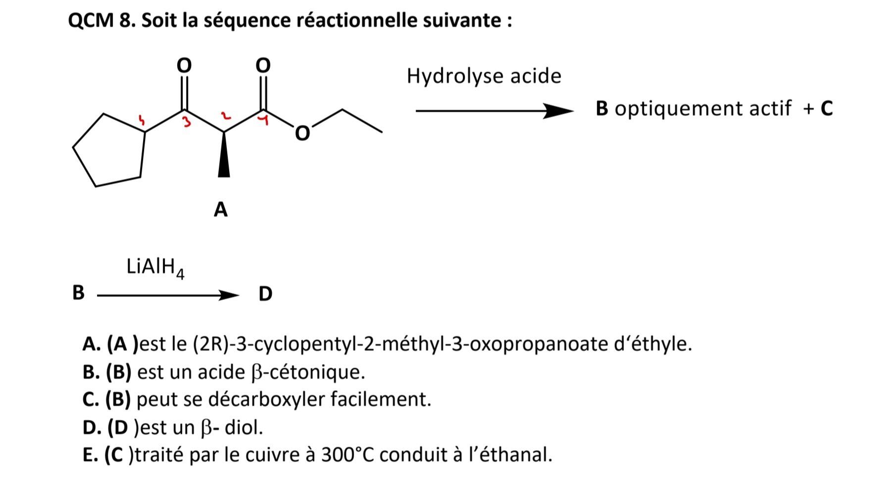 Tuteur Solution léas Posted March 16 Tuteur Solution Posted March 16 Salut @LeucoLeslytes! Je t’ai représenté la réaction pour que ce soit plus clair pour toi : L’hydrolyse acide des esters permet de « couper » l’ester et ainsi d’obtenir un acide carboxylique et un alcool qui sont respectivement B et C. La réduction par LiAlH4 permet de réduire la fonction carboxylique et la cétone en alcools. Au niveau de la correction du qcm : B: VRAI L’acide obtenu est bien un acide B cétonique, il y a une fonction cétone en béta de l’acide. C: VRAI La molécule B peut se décarboxyler facilement , perdre sa fonction carboxylique en chauffant par exemple. D: VRAI On obtient bien un béta diol après la réduction par LiAlH4. E: VRAI L’action du cuivre a 300°C sur la moélcule C ( l’éthanol) est une déshydrogénation, on obtient bien l’éthanal. J’espère que c’est plus clair pour toi, Bin courage ! Rayanodipine, L'Electron_Augé and fashiondesignaaaa 2 1 Quote