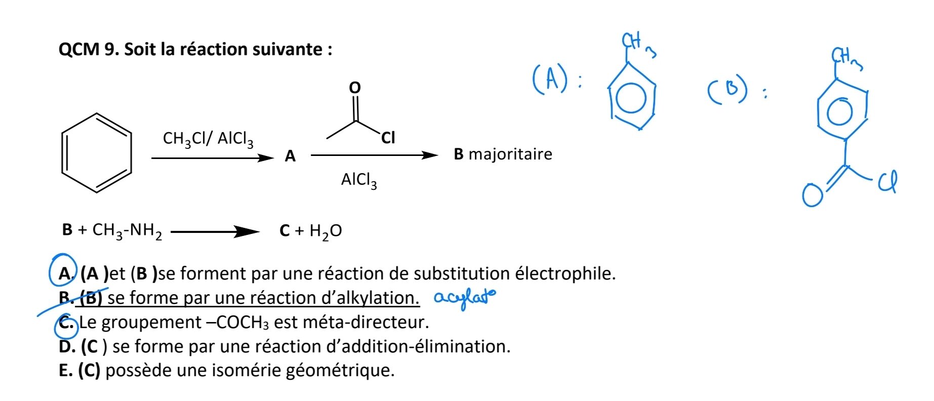 Tuteur Solution léas Posted March 16 Tuteur Solution Posted March 16 Salut @LeucoLeslytes J’ai dessine les produits de la réaction pour que tu visualise mieux: La molécule A que tu avais dessinée est donc juste. La molécule B que tu a dessiné n’est pas la bonne car le groupement que tu ajoutes est ( CO-CH3) et non (CO-Cl). Item A: VRAI B: FAUX , il s’agit en effet d’une acylation C: VRAI: le groupement CO-CH3 est attracteur mésomère donc bien méta directeur D:VRAI: il s’agit bien de l’addition de l’amine sur la fonction carbonyle suivie de l’élimination d’eau. E: VRAI: on a une isomérie géométrique ( Z/E) au niveau de C=N car les substituants sont tous différents. J’espère que c’est plus clair ! L'Electron_Augé 1 Quote