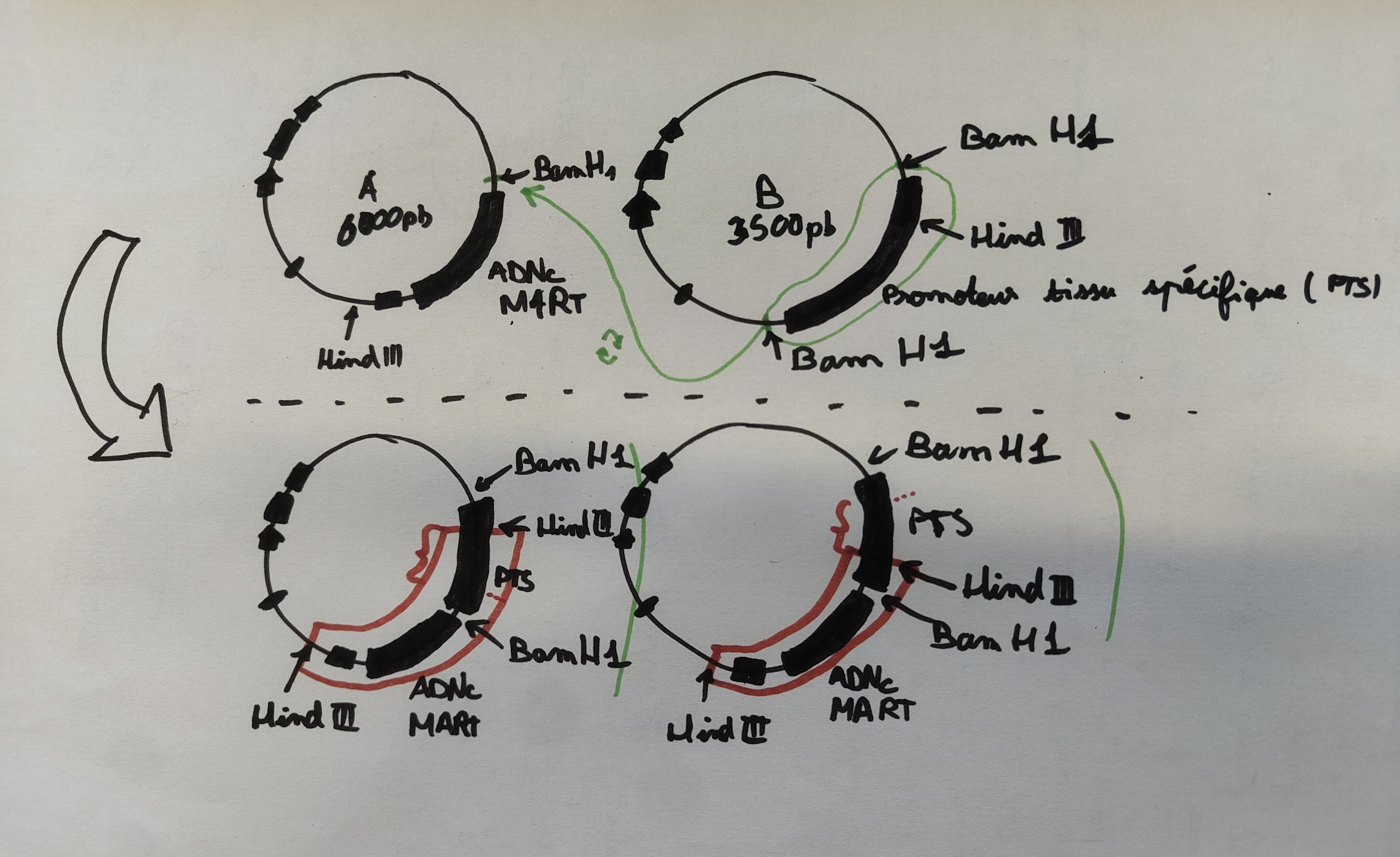 Tuteur Solution mate_ces_teh Posted 6 hours ago Tuteur Solution Posted 6 hours ago Je t'ai déssiné les plasmides recombinants en dessous. Tu peux voir que selon le sens dans lequel la partie verte s'insère, le site HindIII change de position, et donc la partie rouge change de taille. Donc selon la taille des fragments quand tu coupes par HindIII, tu peux déterminer si c'est un sens ou l'autre C'est plus clair ? Maelysss and An-Schwann 1 1 Quote