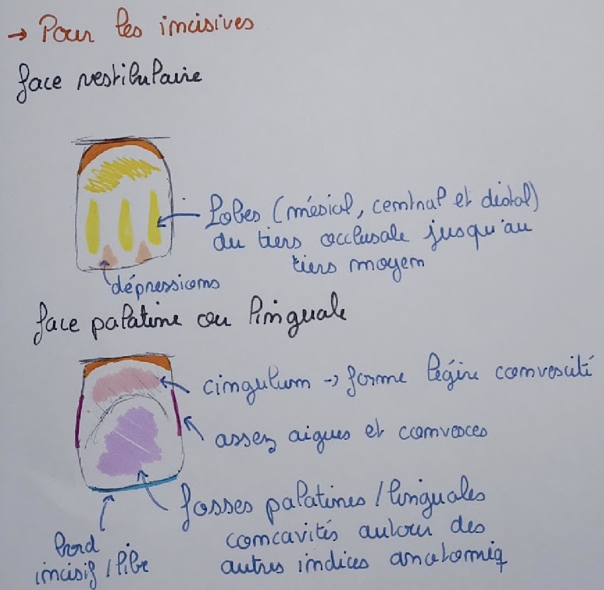 Responsable Matière Solution Anonymous Posted March 18 Responsable Matière Solution Posted March 18 Coucou @mmlsfr ! Je suis passée sur ton post du coup je me permets d’y répondre ;) Je te mets ce super schéma que j’avais fait en PASS pour bien m’y repérer : Révélation jpp il est BIG Pour reprendre l’item : La dent numéro 11 est une incisive donc je te mets le schéma des incisives : En violet c’est comme sur le premier schéma que je t’ai envoyé Le terme mésial est une coordonnée spécifique à l'odontologie qui définit une position le long de la courbe de l'arcade dentaire. Une face ou une crête marginale est dite mésiale lorsqu'elle est la plus proche de la ligne médiane en suivant le trajet de l'arcade, par opposition au terme distal qui désigne ce qui s'en éloigne. Ainsi, pour une dent donnée, la crête marginale mésiale est celle située vers l'avant de la bouche, car elle se trouve "en amont" sur le chemin de l'arcade menant au milieu du visage. À l'inverse, le mot médial appartient à la nomenclature anatomique générale et désigne tout ce qui se rapproche du plan sagittal médian du corps en ligne droite, sans tenir compte de la forme des mâchoires . En odontologie, ce terme est un piège classique car il n'est jamais utilisé pour décrire les bords d'une dent le long de l'arcade ; on utilise soit "mésial", soit les termes lingual ou palatin pour désigner ce qui est orienté vers l'intérieur de la bouche. J’espère que c’est plus clair ^^ Myéline20, MahelpMeDoc, Toto_tfc and 1 other 1 1 1 1 Quote
