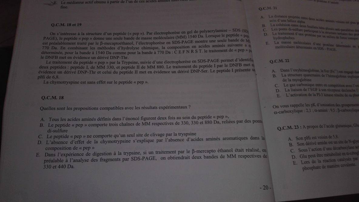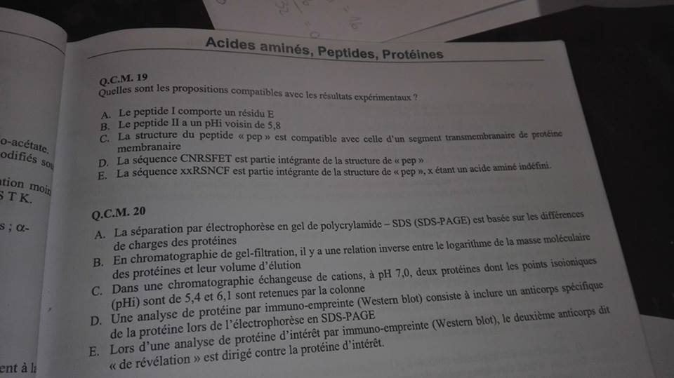 AnnaD Posted December 29, 2016 Posted December 29, 2016 Salut salut ! Ce cours étant nouveau à rangueil je me permets de poster un message sur le forum de purpan pour quémander de l'aide J'ai quelques problèmes sur certains items (les qcms sont en pièce jointe) : QCM 15 : - item B : pour être sûre : est-ce que les groupements immidazoles, guanidinium, thiol etc sont chargés + à la base quand on veut calculer un pHi? Et d'ailleurs ici pourquoi on ne nous met pas le pHi de la fonction thiol de la cystéine? Il faudrait le prendre en compte non? - item C compté faux : je ne comprends pas pourquoi parce qu'il me semble (ou du moins c'est ce que j'ai noté dans mon cours) que la trypsine clive en COOH l'arginine et la lysine... sauf qu'ici je ne vois que la lysine dans ce peptide ce qui fait un seul site de clivage... QCM19 : bon alors là j'aurais bien aimé qu'on me donne quelques conseils méthodologiques pour aller un peu plus vite si possible svp parce que je mets environ 20min et ça me gonfle... on n'a pas que ça à faire de jouer aux devinettes pour trouver quel acidé aminé va où dans la séquence peptidique franchement (on a déjà la moitié voire un peu plus de notre épreuve qui est constituée de qcms de réflexion assez longs à résoudre) Merci d'avance