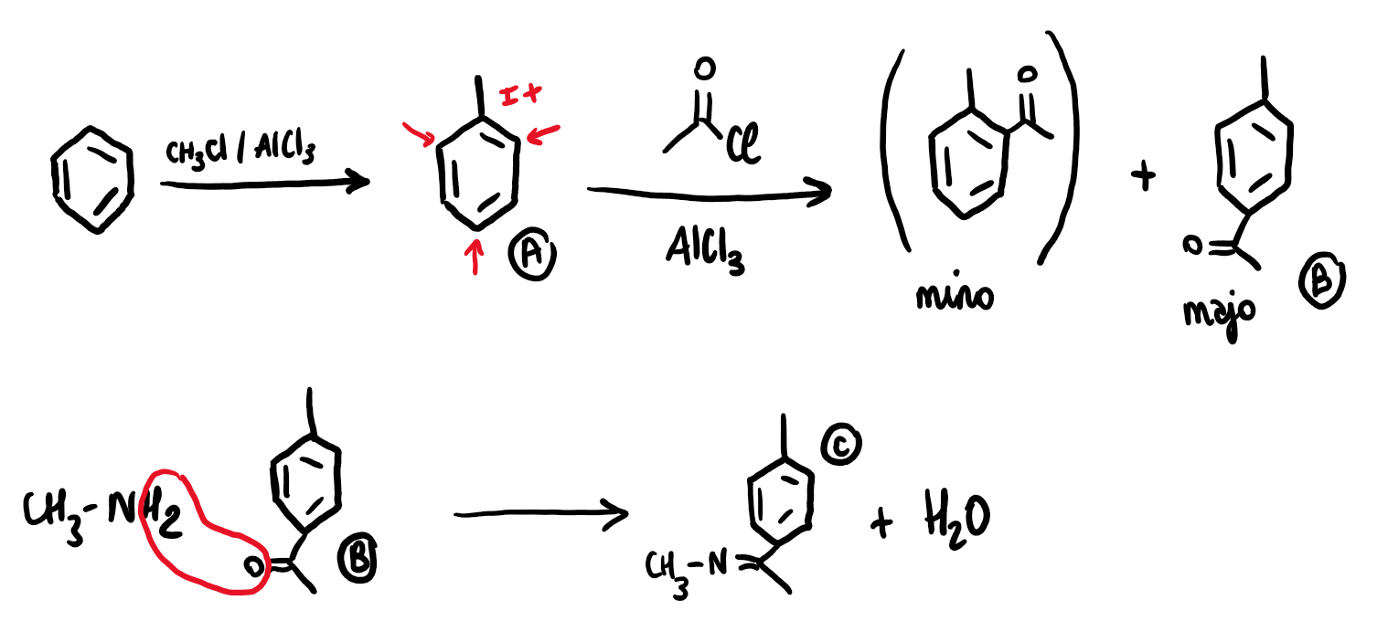 Tuteur Solution Ornithorynque Posted March 21 Tuteur Solution Posted March 21 Coucou Alors pour commencer je t'ai écrit la réaction : Pour avoir le composé B, il faut que tu rajoutes le groupement sur ta molécule. Hors il ne va pas se placer n'importe où, cela dépend du groupement déjà présent sur le cycle. Comme le méthyl possède un effet donneur, il oriente en ortho ou para (comme je l'ai indiqué avec les flèches en rouge). Le composé majoritaire est celui en para car il y a moins d'encombrement stérique que l'autre forme en ortho Pour que ce soit plus facile à voir qu'est-ce que tu dois mettre sur le cycle, personnellement je me dis qu'il doit se former un HCl (donc que le Cl sur la molécule va partir et arracher un H du cycle). Donc ta molécule se retrouve avec une charge (+) tandis que ton cycle lui aura une charge (-) étant donné qu'il a perdu un H ! Puis hop tu colles les 2 parties pour annuler les charges Ensuite pour avoir le composé C, il faut se dire que si en ajoutant une amine (NH2) tu obtiens de l'eau, alors tu dois faire la technique du lasso ! Tu vois sur le schéma c'est clair on comprend de suite ! Et enfin une isomérie géométrique c'est Z ou E ! Pour en avoir une, il faut une double liaison et aussi que les groupements du même côté de celle-ci soient différents. Il faut faire attention ici à ne pas oublier le doublet non liant de l'amine qui rentre en compte ! Donc effectivement la molécule C possède bien une isomérie géométrique puisqu'elle peut être Z ou E J'espère que tu as compris, courage pour cette dernière ligne droite L'Electron_Augé and Rayanodipine 2 Quote