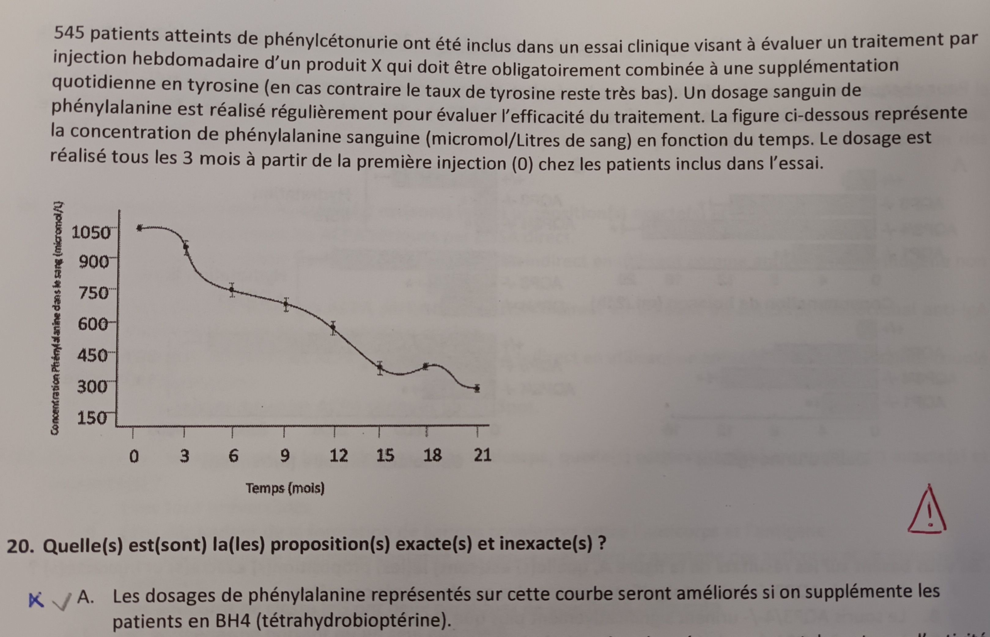 J.L.D Posted yesterday at 05:43 PM Posted yesterday at 05:43 PM Bonjour, Sur le QCM 20 du sujet de cette année, on nous montre une courbe des dosages de phénylalanine chez les patients, suite à un traitement, tout en nous disant que les taux de tyrosine restent très bas s'il n'y a pas de supplémentation. Donc personnellement, j'en avais déduit que le traitement en cours n'était pas du BH4, car sinon les taux de tyrosine auraient pu augmenter. Donc je ne comprends pas pourquoi l'item A est compté faux : "les dosages de phénylalanine représentés sur cette courbe seront améliorés si on supplémente les patients en BH4 (tétrahydrobioptérine)" Je croyais que les patients répondant au BH4 étaient : ceux avec un déficit en BH4 (rares), mais aussi une proportion non négligeable d'autres patients, sans que l'on sache très bien pourquoi (en tous cas il me semblait avoir compris ça pendant le TD de médecine). Et je croyais aussi que les patients ne répondant pas au BH4 étaient notamment ceux dont le site catalytique étaient muté (car même si c'est dans la bonne configuration, le site ne fonctionne pas donc il n'y a pas de résultats). Or, dans l'énoncé, rien ne nous dit que les patients vont ou non répondre au BH4, donc je ne comprends pas comment il fallait raisonner pour répondre à la question. Merci d'avance ! lADNry 1 Quote