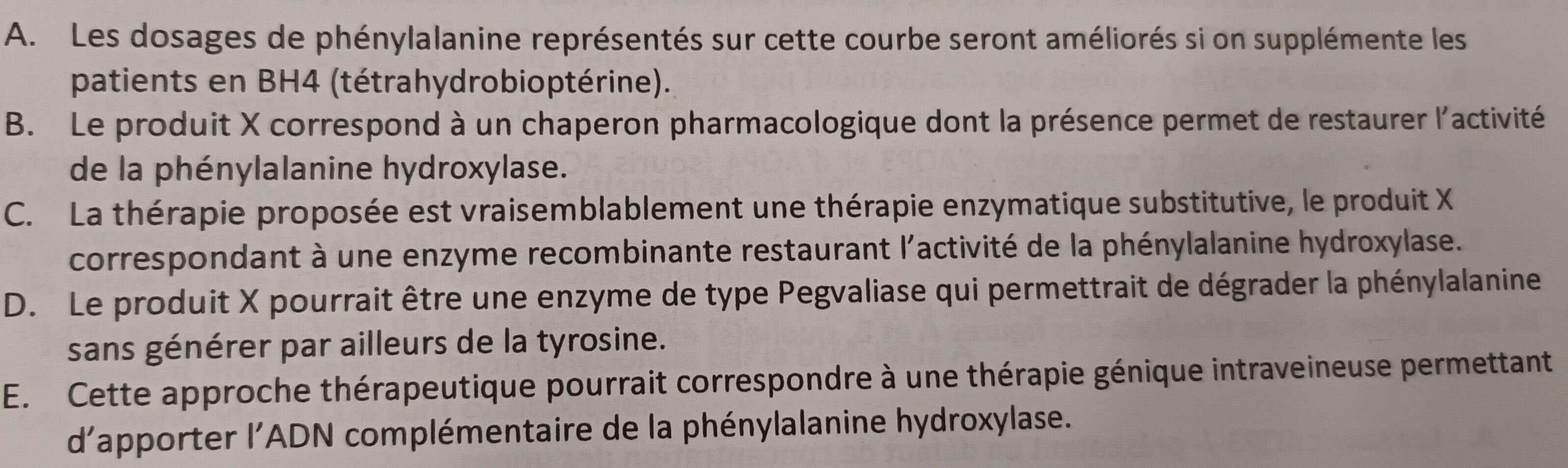 Solution Estherification Posted yesterday at 06:55 PM Solution Posted yesterday at 06:55 PM (edited) Ok alors je laisserai un tuteur confirmer mais selon moi : Dans l’énoncé, on précise qu’une supplémentation en tyrosine est OBLIGATOIRE car son taux reste bas. Cela signifie que la conversion de la phénylalanine en tyrosine via la PAH ne fonctionne pas correctement. -> item B, C et E faux car si on restaure l'activité de la PAH pas besoin de supplémenter en Tyr or la on dit que ca reste bas Dans le cours on nous dit que l'approche thérapeutique de supplémentation de BH4 n’est efficace que dans 30% des cas donc on ne peut pas affirmer que ça sera efficace -> item A est faux (en plus avec X on a déjà une baisse de la Phe et un apport en Tyr donc pas besoin de tester d'ajouter du BH4 en plus) En revanche, la courbe est compatible avec un traitement de type Pegvaliase ou PAL, qui dégrade directement la phénylalanine sans produire de tyrosine (besoin d'apport en Tyr et baisse des taux de Phe) -> seul l'item D est vrai Edited 23 hours ago by Estherification Quote