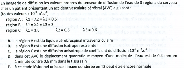 Dès lors, sachant que tu te places dans un cas concret, avec la présence d'un AVC, il semble d'autant plus logique de penser que le LCS IV correspond d'avantage à la région B (qui se rapproche beaucoup de l'eau pure, par définition, c'est un liquide très clair, très pur) plutôt que la région A (avec un coefficient de diffusion assez faible, pouvant indiquer la présence de SG ou... de sang éventuellement. En effet, dans le sang, la diffusion est moindre, à cause de la présence des éléments du sang. Or tu te places dans le cas d'un AVC qui peut être une défaillance hémorragique).
