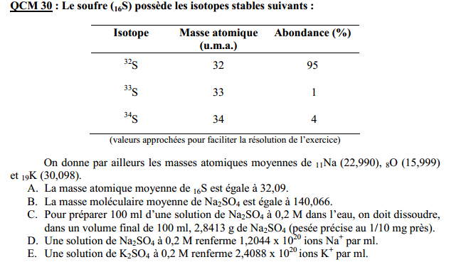 Solution Guest Cam23 Posted December 28, 2013 Solution Posted December 28, 2013 Salut, Concernant l'item D, ton erreur vient du fait que tu n'as pas pris en compte que le Sodium est présent dans la solution fois 2 car on parle de Na2So4 : donc on obtient 2.4088.1020 ions par ml. Pour ta question suivante, il faut faire n=m/M ==> On obtient donc 5/28.11= 0.178 mol et on trouve bien un nombre différent de 178 mol Bon courage pour tes révisions. Camille