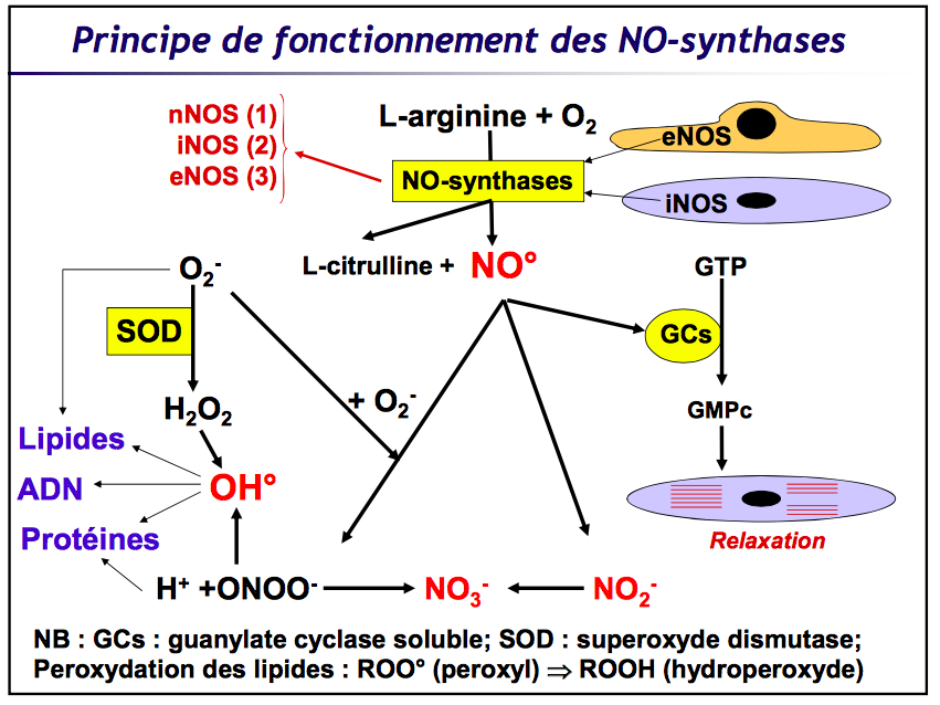 Solution FowlMax Posted April 11, 2017 Solution Posted April 11, 2017 Salut, Alors honnêtement, quant à ton interrogation sur ce qu'il faut comprendre de cette réaction : Il faut surtout savoir que le NO° est engagé principalement dans la voie de la relaxation vasculaire puisqu'il est très réactif et très peu diffusible (par son caractère radicalaire instable qui veut à "tout prix" perdre cette forme). Dès lors, cela peut t'ouvrir des voies de réflexion dans l'éventualité où la voie qui le consomme (voie des NOS) serait déficiente, ou dysfonctionnelle, et donc que le NO° serait d'avantage disponible pour emprunter les autres voies. En effet, de par son caractère radicalaire et la grande diversité de groupements atomiques qui "matchent" avec le NO°, cela te montre globalement qu'il pourrait être à l'origine d'un grand stress oxydatif puisque certains de ses "partenaires" (comme l'O2-) sont nécessaire à certaines constructions biochimiques, mais ils pourraient dévier, se retrouver avec le NO° et former du H2O2 (c'est pas super pour le corps si tu te rappelles du cours du Pr. Courbon ). Le plus important sur cette partie de cours reste de maîtriser sur le bout des doigts toute la fonction de relaxation musculaire par les NO synthases !