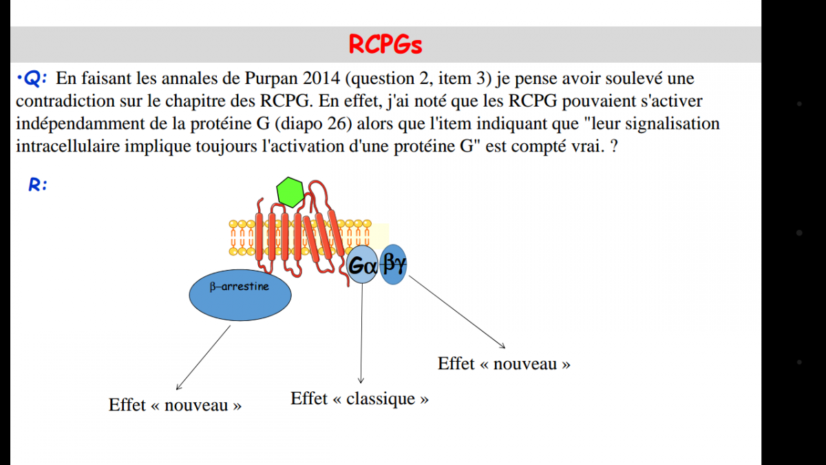 EmLgr Posted April 15, 2017 Posted April 15, 2017 Salut ! Alors pendant une séance de réponse aux questions le Pr. Senard avait répondu que la signalisation impliquait toujours une protéine G mais pas forcément l'effet ! Déjà je suis pas sûre de bien saisir toute cette partie Mais au CCB du tat l'item : Les RCPG sont en permanence couplés à une protéine G est compté faux et on parle de désensibilisation... Je vois pas ce que ça viens faire la .... Voilà ! Merci