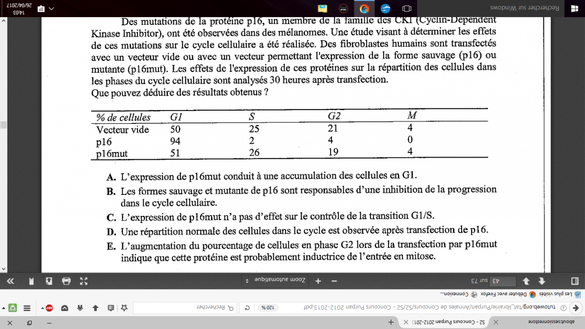 Chalize Posted April 26, 2017 Posted April 26, 2017 Bonjour, je ne comprend pas trop la correction de ce qcm (j'ai mis l'énoncé en pièce jointe) A est compté faux, effectivement c'est p16 qui conduit à une accumulation en G1 et pas p16 mut. B est compté vrai, pourtant les valeurs données pour p16 mut correspondent quasiment à celles du vecteur vide donc j'en déduis que p16 mut n'a pas tellement d'effet (c'est le raisonnement que j'ai utilisé et qui ne marche pas apparemment ) Donc j'aurai dit que ce n'est que p16 (sauvage et pas mut) qui est responsable d'une inhibition de la progression du cycle. C, compté faux pourtant je ne vois pas quel effet a p16 mut entre G1 et S quand on compare aux valeurs du vecteur vide (valeurs quasiment identiques) D, compté vrai alors que la répartition des cellules me semble justement anormales quand on utilise p16 E, compté vrai, donc on compte vrai le fait que p16 mut soit un inducteur alors qu'à l'item B on compte vrai qu'il soit responsable d'une inhibition de la progression du cycle. bref je suis un peu (beaucoup) à côté de la plaque sur ce QCM, donc si quelqu'un pouvait m'éclaircir la chose je suis preneur! Merci