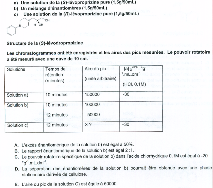 Fiona Posted May 10, 2017 Posted May 10, 2017 Salut, pour l'identification des énantiomeres, jai utilisé le temps de rétention, et non l'aire La solution A est énatiomériquement pur: on observe un pic a 10 min, cela correspond au temps de rétention de l'enantiomere S, il faut que tu vois ca comme une caractéristique du cet énantiomére ( bien évidement dans les conditions de l'expérience). Et en suite pour la solution C qui est elle aussi énantiomériquement pur, contient seulement l'énatiomere R, tu vois que lui il sort à 12min Donc ensuite tu rapportes ces données dans la solution b J'espere que je suis claire, sinon n'hésite pas, en esperant t'avoir aidé