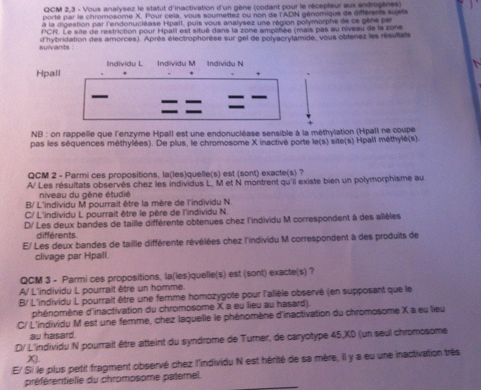 Guest ivandushit Posted January 10, 2014 Posted January 10, 2014 Bonjours, Cas de l'individu L : Une seule bande(-) il s'agit donc d'un homme. L'abscence de bande(+) écarte la possibilité que se soit une femme homozygote pour qui l'inactivation a eu lieu au hasard sinon on retrouverait une bande de même taille en (+). Cas de l'individu M : 2 bandes (+) et (-) Il s'agit donc d'une femme hétérozygote pour qui l'inactivation de l'X c'est faite au hasard. Cas de l'individu N : 2 bandes (-) une bande (+) , il s'agit probablment d'une femme hétérozygote pour qui la métylation n'a lieu que sur un seul des 2 allèles. Il n'y a pas de délétion dans cet exercice ! l'abscence de bande temoigne seulement de la méthylation qui à court-circuité la PCR J'espère que c'est un peu plus clair, sinon n'hésite pas à poser d'autres questions. Je m'excuse pour le retard, j'étais en partiel.