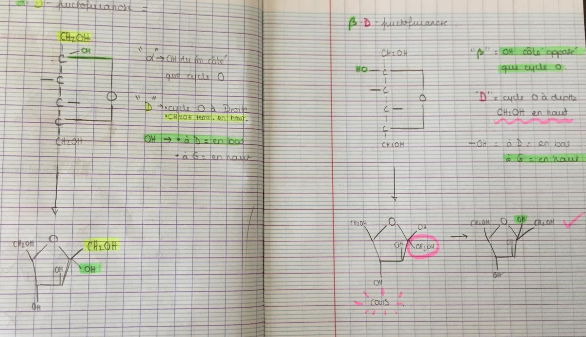 Solution Chat_du_Cheshire Posted September 7, 2017 Solution Posted September 7, 2017 Salut Zoé Je te cite la règle concernant ton problème sur mon cours de Rangueil (on a la chance de tout avoir sur les glucides ) '' Les OH orientés à droite sont représentés vers le bas... ... Sur le C2 on place d'abord le OH hemiketalique puis le C1 porteur de la fonction alcool prend la position vacante '' ce qui est bien en cohérence avec ton cas !