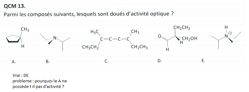 Zoee Posted October 28, 2017 Posted October 28, 2017 Je profite de ce post pour poser une question sur l'image 1: la C : pas de double liaison C=C donc sans même regarder ce que portent les les deux carbonnes : pas de diastéréoisomérie possible, non ? la E est juste car 1/2 et 3/4= énantiomères ( je me trompe ? ) : un mélange équimolaire de 1/2 annule l'effet sur la lumiere polarisée et idem pour 3/4 donc au final pas d'effet sur la lumière polarisée? et est-ce que les énantiomère représente un cas particulier des molécules chirales, ou c'est l'inverse ? ou ça n'a rien à voir ? ou c'est la meme chose ? Merci!