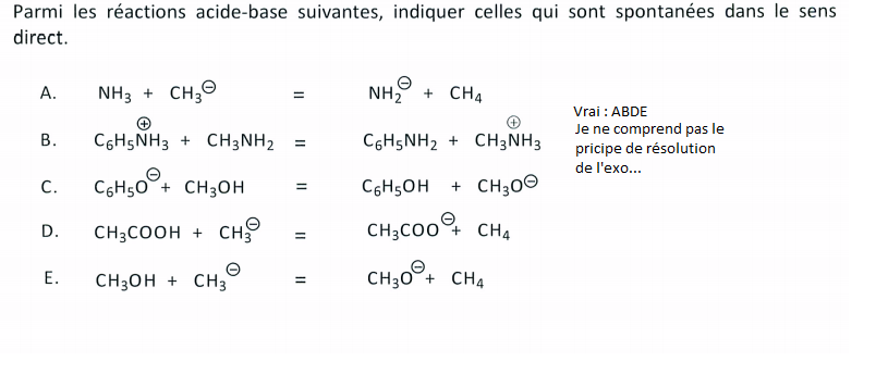 Fugu Posted October 29, 2017 Posted October 29, 2017 La B est vrai car le C6H5NH3+ --> c'est donc une amine lié au groupe phenyl, donc il a beaucoup d'effets mésomères ce qui le rend plus acide que l'acide présenté sur la droite (CH3NH3+) Ou tu peux réfléchir de même avec le bases, personnellement je raisonne avec les acides (vu que si un acide est fort sa base conjuguée est faible) donc tu as la base de gauche : CH3NH2 et la base de droite qui est C6H5NH2, la mésomérie n'est pas en faveur de la basicité, donc la molécule ayant le moins de mésomérie est ici la plus basique. Donc vu que tu as l'acide fort qui réagit avec le base forte, c'est donc dans le bon sens, voilà