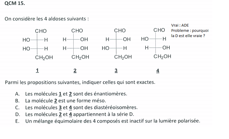 Ancien du Bureau sskméta Posted October 29, 2017 Ancien du Bureau Posted October 29, 2017 (edited) la C : pas de double liaison C=C donc sans même regarder ce que portent les les deux carbonnes : pas de diastéréoisomérie possible, non ? même sans double liaison on peut avoir de la diastéréoisomérie, la définition est : stéréoisomères qui ne sont pas énantiomères. Le 3 et le 2 sont par exemple diastéréoisomères. la E est juste car 1/2 et 3/4= énantiomères ( je me trompe ? ) : un mélange équimolaire de 1/2 annule l'effet sur la lumiere polarisée et idem pour 3/4 donc au final pas d'effet sur la lumière polarisée? oui Edited October 29, 2017 by sskm