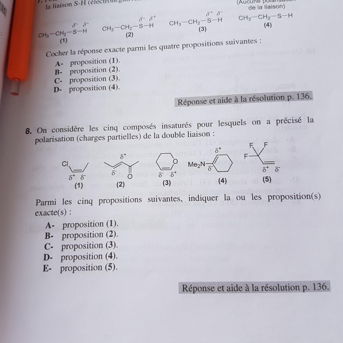 Solution Zel Posted November 3, 2017 Solution Posted November 3, 2017 Salut ! J'ai un peu de mal à comprendre ta question, j'essaye de répondre et tu me dis si j'ai répondu à côté ! Je ne sais pas comment déterminer l'electronégativité d'un groupe d'atomes qui m'aidera à déterminer les effets inductifs ou mésomères." Les atomes sont de plus en plus électronégatifs au fur et à mesure qu'on se déplace vers la gauche et vers le haut du tableau périodique (à l'exception de la dernière colonne), les plus électronégatifs de tous étant N, O, F. De plus, pour déterminer l'electronégativité d'une double liaison je ne sais pas comment faire. Je suis aussi bloquée.. Les doubles liaisons ne sont pas électronégatives ! On ne parle d'électronégativité que pour des atomes et des ions Trois principes importants à retenir :-En l'absence d'effet mésomère, un groupe d'atomes électronégatif polarise les doubles liaisons "dans son sens", elle seront négatives de son côté et positives du côté opposé. -Lorsqu'un atome possède un doublet non liant ET qu'il est attaché via une liaison simple il est donneur par effet mésomère (Il aura tendance à donner son doublet pour créer une double liaison). Cet effet diminue lorsque l'électronégativité augmente, mais il est toujours présent ! Exemple : l'oxygène d'une fonction alcool aura tendance à donner un doublet pour former une double liaison avec la molécule (il sera alors chargé positivement).-Lorsqu'un atome électronégatif est attaché via une double (ou triple) liaison, il est attracteur par effet mésomère (il y a d'autres configurations mais en pratique c'est surtout celle-là qu'on retrouve). Par exemple, l'oxygène de tout à l'heure, une fois qu'il a donné son doublet, aura tendance à vouloir le récupérer. J'essaye de te résoudre le QCM 8 item par item A- Je dirais VRAI, le Cl possède un doublet non liant ET est lié via une liaison simple, il est donc donneur mésomère, il va donner un doublet pour former une double liaison entre lui et le C1, qui va délocaliser la double liaison C1-C2 en C2-C3. Elle a donc tendance à bouger vers la droite, ce qui explique la polarité (négatif à droite veut dire qu'elle est "orientée" vers la droite). B- Fonction cétone = atome électronégatif attaché avec une double liaison, donc attracteur par effet mésomère. Il aura tendance à pécho un doublet en transformant sa liaison en liaison simple, ce qui va délocaliser la liaison entre le C3 et le C4 vers lui (vers la droite). Donc la liaison tend vers la droite, elle est "orientée" vers la droite, le négatif devrait être à droite, l'item est FAUXC- Pareil que A, l'O est lié via liaisons simples et possède un doublet non liant, il est donneur mésomère, ce qui tend à délocaliser la double liaison vers la gauche, les charges sont donc bien placées (négatif à gauche), l'item est VRAI D- L'azote lié aux deux méthyls est donneur par effet mésomère (possède un doublet non liant, lié à des liaisons simples), il tend à délocaliser la double liaison vers la droite, les charges sont mal placées, c'est FAUX E- Là c'est des bâtards ahah, les fluors sont donneurs par effet mésomères, on pourrait penser que les charges sont bien placées, sauf qu'il y a un atome "de trop" entre eux et la double liaison, donc s'ils donnent un doublet, ils vont créer une double liaison sans délocaliser l'autre (elles seront juste conjuguées). Du coup dans ce cas la double liaison initiale est insensible à l'effet mésomère, l'effet inductif attracteur des fluors domine, elle devrait être orientée vers la gauche, l'item est FAUXJe sais pas si ça t'a aidé, tu pourrais nous dire d'où tu as tiré ces QCM ? Ça ressemble pas à la façon dont la prof de chimie orga pose les questions...