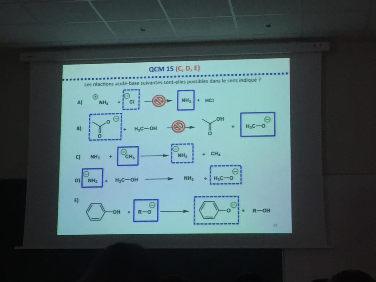 Solution TiBiscuit Posted November 20, 2017 Solution Posted November 20, 2017 Bonjour bonjour, En effet, ici on cherche l’acide le plus fort ou la base la plus forte parmis les couples NH4+/NH3 et HCl/Cl- Difficile de savoir au premier abord qui est le plus acide entre NH4+ et HCl car ils ont tous les 2 un caractère acide très marqué. Cependant, on sait que NH3 (ammoniac) est assez basique alors que Cl- est la base conjuguée de HCl (la base conjuguée de quelque chose de très acide est toujours une base faible). Si NH3 est la base forte, alors NH4+ est l’acide faible, donc HCl l’acide fort et Cl- la base faible. Ta réaction sera donc HCl + NH3 → Cl- + NH4+ Attention au choix des mots dans ta question cependant, la réaction de l’item A est possible, juste pas dans le sens indiqué En espérant avoir répondu à ta question. (Si ce message vous a été utile, merci de le marquer comme RÉSOLU pour améliorer la visibilité du forum)