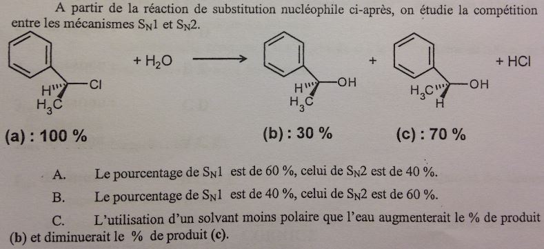 Ancien du Bureau Solution teyss Posted January 9, 2014 Ancien du Bureau Solution Posted January 9, 2014 D'abord tu dois identifier quel produit est issu d'une SN1 et quel produit est issu d'une SN2 (en connaissant bien les propriétés de chacune, A et B deviennent évidents ->VIII.2. "SN1 (1)" et SN2 (1) pour bien comprendre. Pour la C, ce n'est pas écrit dans le cours, mais les réactions SN1 sont favorisées par les solvants polaires et les SN2 par les solvants apolaires. (ça s'explique par le fait qu'on ait un intermédiaire ionique (-> carbocation) stabilisé par un solvant polaire dans la SN1, qui se forme donc plus facilement. Dans la SN2, c'est le composé nucléophile qui est stabilisé, ralentissant la réaction. Mais je ne pense pas que tu aies à savoir tout ça )