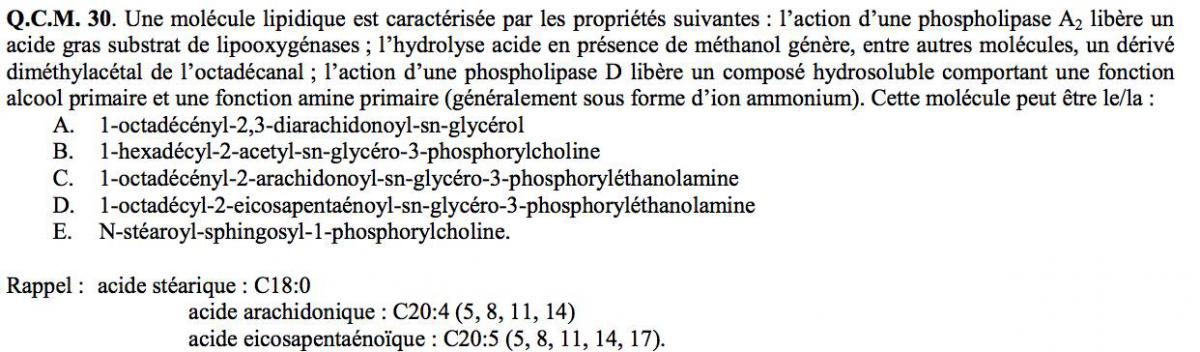 Solution Porthos Posted December 7, 2017 Solution Posted December 7, 2017 Salut, Alors d'après l'énoncé: - Ton lipide est sensible à A2 et donne un AG sensible à la lipo-oxygénase: c'est donc un glycérol car sensible à A2 (je pense) en sn2 du glycérol on a un acide arachidonique C20:4 car c'est le précurseur des leucotriènes par lipo-oxygénase -Par methanolyse acide il libère un octadécanal donc en sn1 du glycérol on a un AG à 18C le octa-décényl ou acide stéarique donné dans l'énoncé -Par phosphypase D on libère un composé hydrosoluble avec une amine primaire la phospholypase D coupe après le phosphate en sn3 du glycérol et vu la description du composé c'est une ethanolamine -> on a donc une 1-octadécényl 2-arachidonyl glycérol phosphoéthanolamine soit la réponse C bingo