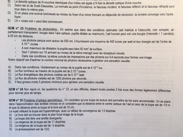 Solution Lucas2 Posted December 21, 2017 Solution Posted December 21, 2017 Salut, alors je vais essayer d'être assez clair avec cet exercice qui est loin d'être le plus simple. Dans ce genre d'exercice la source de lumière est isotrope et orthotrope, on a donc le droit de dire : puisqu'elle est isotrope : que la densité de flux lumineux (É accent) dépend de l'intensité : É = I/R2 avec R la distance entre la source et l'objet. Par ailleurs on peut aussi dire que le Flux (F) vaut : F = É x S (avec S la surface de la zone éclairé) puisqu'elle est orthotrope on peut distinguer l'éclairement (densité de flux lumineux atteignant un objet éclairé par la source) : Eclairement = L x oméga (avec L la luminance et oméga l'angle solide) de l'émittance (densité de flux lumineux émis par la source du point de vu de l'objet). Ici on connait l'intensité de la bougie et sa distance par rapport à l'oeil. On peut donc calculer la denstité de flux lumineux, qui correspond à l'éclairement : É = I/R2 = 1/(50 x 103)2 É = 1/(25 x 108) = 0.04 x 10-8 = 4 x 10-10 lux ( A VRAI) A partir de ça on multiplie par la surface de l'oeil pour obtenir le Flux lumineux (de 50mm2) sachant que 50mm2 = 50 x 10-6m2. On a donc : 4 x 10-10 x 50 x 10-6 = 2 x 10-14 lumen. (B VRAI) De plus on sait que les photons fournissent 400 lumen par Watt, on peut donc convertir nos lumen en Watt : 1W = 400Lumen, donc (2 x 10-14)/400 = 0.5 x 10-16 = 5 x 10-17 Watt (C FAUX)) Ce qu'il faut maintenant savoir c'est que 1W = 1J/s et on nous dit que chaque photon émet une énergie de 4 x 10-19 J (par rapport a notre énergie totale qu'on a calculé en Watt donc J/s, on peut donc calculer a combien de photons ça correspond, en divisant par l'énergie de chaque photon) : (5 x 10-17)/(4 x 10-19) = 5/4 x 102 = 1.25 x 102 = 125 photons par secondes (D FAUX). Enfin, on sait qu'une sensation visuelle est produite en 0.4 secondes, avec un flux de 125 photons par seconde, sachant que 1 photon sur 10 seulement n'est absorbé. En fait en 0.4 seconde, 125 x 0.4 = 50 photons traversent la rétine, ce qui signifie, puisque seulement 1 photon sur 10 intéragit, que seul 50/10 = 5 photons sont nécessaires à la sensation visuelle. (E vraie). J'espère que ça te convient sinon dis moi si certains point te semblent obscurs