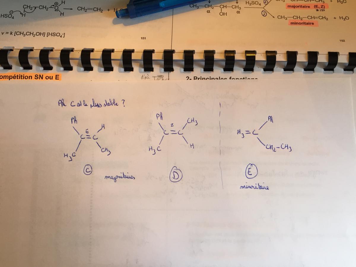 Mr_Mime Posted December 24, 2017 Posted December 24, 2017 Bonjour, j'ai une incompréhension sur le QCM 12, TD 5 Dans l'exercice, le 2-phénylbutan-2-ol subit une deshydratation (ici du coup alcool tertiaire) et ma question se porte sur l'orientation de l'élimination On obtient d'après l'énoncé, 3 isomères avec C et D majoritaires et E minoritaire et C plus stable que D Alors E est l'alcène formé avec le carbone en alpha du OH qui porte un plus grand nombre d'hydrogènes (donc le moins substitué) et il est minoritaire face à C et D qui sont des alcènes formés par un carbone plus substitués (=> régiosélectivité, élimination régiosélective, règle de Zaitsev) là où je ne comprends pas c'est pourquoi C(alcène E) est plus stable que D(alcène Z) d'après la correction et l'énoncé Si on pouvait m'éclairer, ce serait gentil et s'il y a besoin de plus de précision... Merci Quote