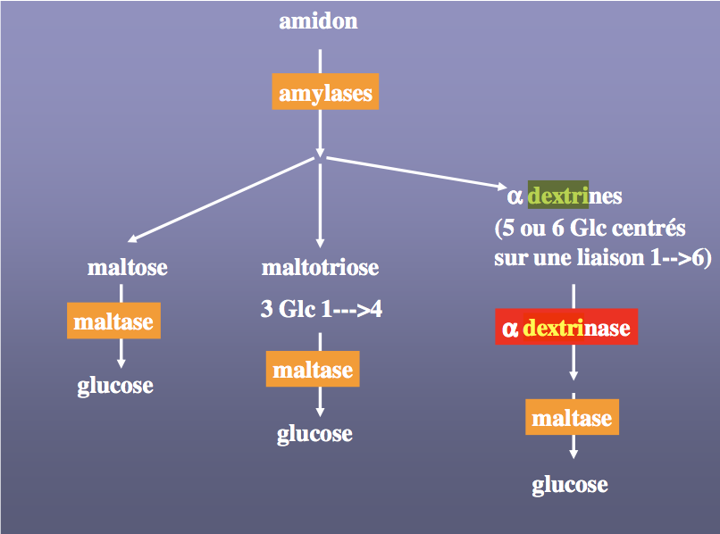 Oberyn Posted December 26, 2017 Posted December 26, 2017 Oui c'est ça, hydrolyse complète c'est couper l'amidon en glucose. Mais ici tu vois bien dans la diapo que pour arriver au glucose, on passe par 3 intermédiaires à savoir le maltose, le maltotriose et les alphadextrines.. Les 3 peuvent être dégradés en glucose, par des enzymes différentes. Donc quand on te dit "Les alpha dextrinases sont indispensables pour l'hydrolyse complète de l'amidon" cet item est bien faux, car pour avoir du glucose, on ne passe pas que par des alphadextrines mais aussi par du maltose et maltotriose qui ne nécessitent pas l'intervention d'une alphadextrinase. Ce n'est donc pas indispensable Par contre, si on avait demandé "les maltases sont indispensables à l'hydrolyse complète de l'amidon", alors là c'était vrai, car les maltases sont utilisées dans les 3 cas. Quote