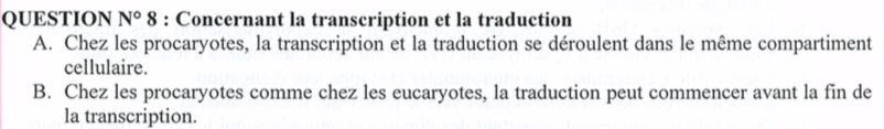 Solution Magnum Posted January 6, 2018 Solution Posted January 6, 2018 Bonjour!Pour la 8B : Chez les procaryotes, tout est au même endroit, donc les ribosomes peuvent commencer la traduction avant la fin de la transcription. Chez les eucaryotes, c'est plus complexe la traduction se fait dans le cytoplasme faisant intervenir des ARNt.Donc 8B fauxPour la 10 A : Comme neïla l'a spécifié, l'origine des mitochondries est une endosymbiose. Ce qui veut dire que les mitochondries disposent de système de transcription, de réplication et de translocation autonomes, qui combinent les propriétés procaryotes et eucaryotes Voilà donc pourquoi la 10 A est vrai Quote