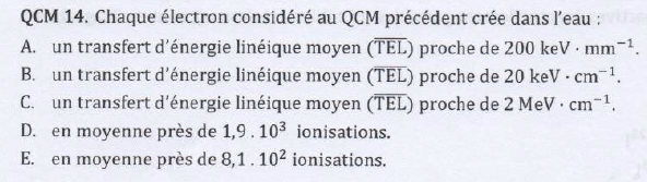 NomdeZeus Posted January 8, 2018 Posted January 8, 2018 Bonjour ! Je sais qu'il a déjà était corrigé dans d'autres sujets du forum mais les corrections ne répondent pas à mon soucis... J'ai quelques petits problèmes pour comprendre les réponses A et C du QCM 14 qui sont vraies.. Par exemple pour la A je trouve 2000keV/mm alors que cela devrait être 200keV/mm et après je ne suis de comprendre comment on fait le passage de keV/mm en MeV/cm Je vous mets en photo ma démarche et l'image du sujet. En espérant que quelqu'un puisse m'expliquer ceci, merci d'avance ! https://image.noelshack.com/fichiers/2018/02/1/1515420308-img-e3298.jpg Quote