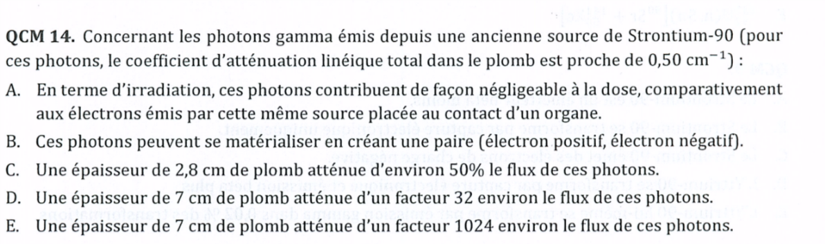 Cobb Posted January 8, 2018 Posted January 8, 2018 Bonsoir ! Je comprends pas pourquoi l'item D est bon dans le QCM 14... Mon raisonnement est que nCDA= épaisseur (si l'item est juste) Ici CDA du plomb= 0.5cm et l'épaisseur de 7cm Ce qui donne nx0.5 = 7 soit n=14 On finit donc avec 2^14 soit un facteur 16384 Cependant l'item est compté juste avec un facteur 32 Peut-être qu'un topic est déjà dessus mais j'ai pas trouvé... Merci d'avance ! Quote
