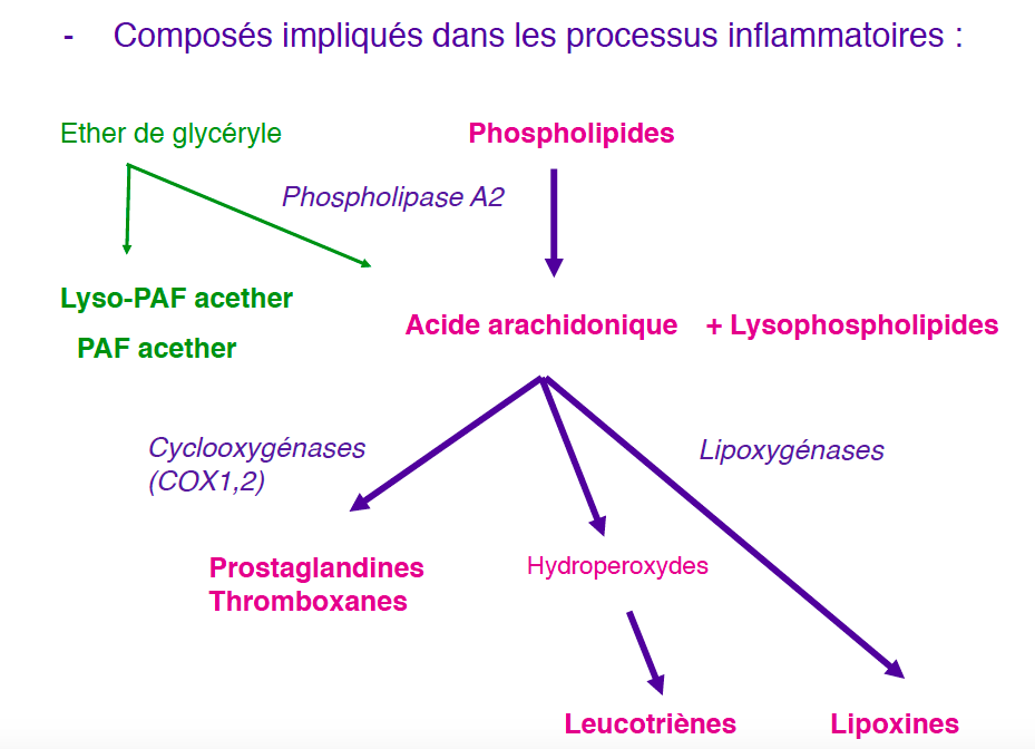 Solution Ombeline Posted January 11, 2018 Solution Posted January 11, 2018 Bonsoir, Les PAF acéthers sont des facteurs d'activation des plaquettes, pro-coagulants, interviennent dans les allergies et les inflammations. Ils sont hydrosolubles et porteurs de liaison étheroxyde en position 1 (sont donc résistants à la phospholipase A1). L'éther de glycéryl permet la formation de lyso-PAF acéther, PAF acéther et acide arachidonique. C'est tout ce que tu dois savoir. Bon courage Quote