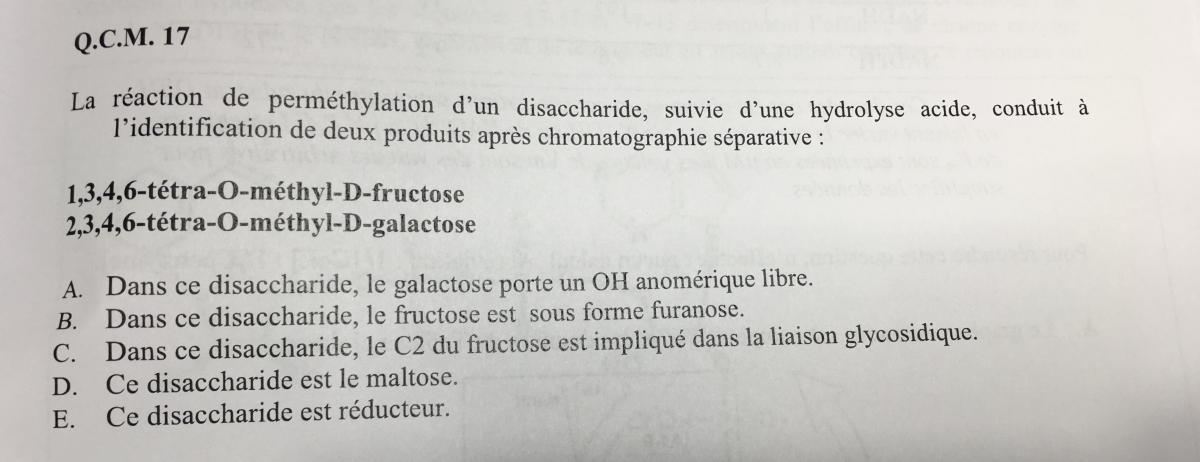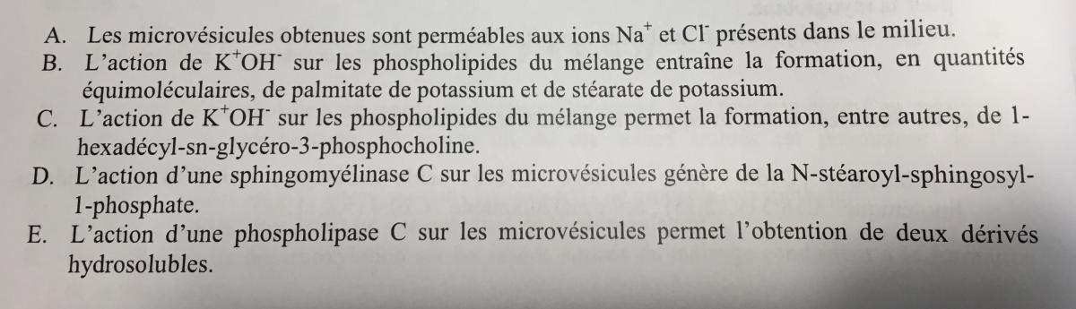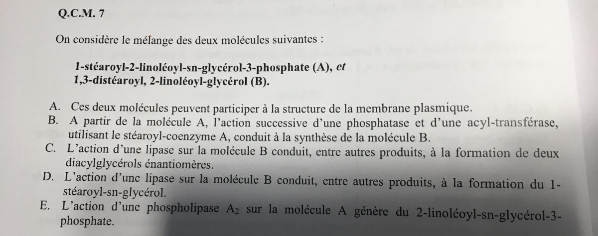 ldd Posted January 14, 2018 Author Posted January 14, 2018 Bonsoir Pour le qcm 7 item C : Vrai. Quand tu as le même AG en position I et III, l'action d'une lipase libèrera d'abord l'AG en position I ou III, et donc cela formera 2 énantiomères. Item D : Comme dit plus haut, la lipase attaque d'abord l'AG en position I ou III, il est donc impossible de se retrouver avec un AG qui aurait perdu son AG en position 3 et surtout en position 2 (qu'il perd en dernier!), et qui ne se retrouverait qu'avec l'AG I. Est ce que pour les autres QCM tu pourrai m'envoyer la correction stp? C'est pour voir si c'est en adéquation avec mes réponses afin de pas te dire de bétises Très bien, je comprend mieux, pour les autres qcm les réponses sont QCM 8 : C E et QCM 17 : B C merci Quote
